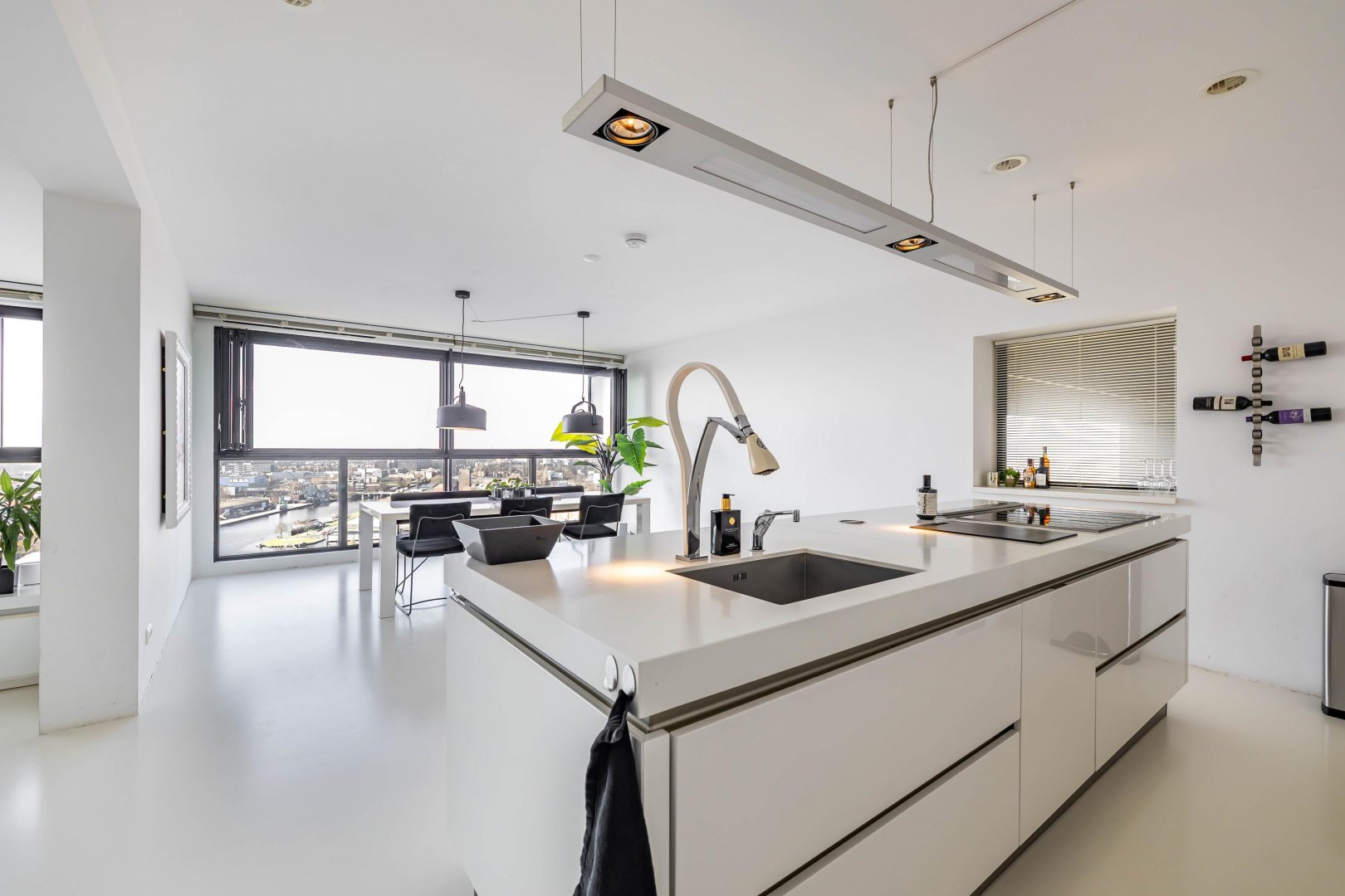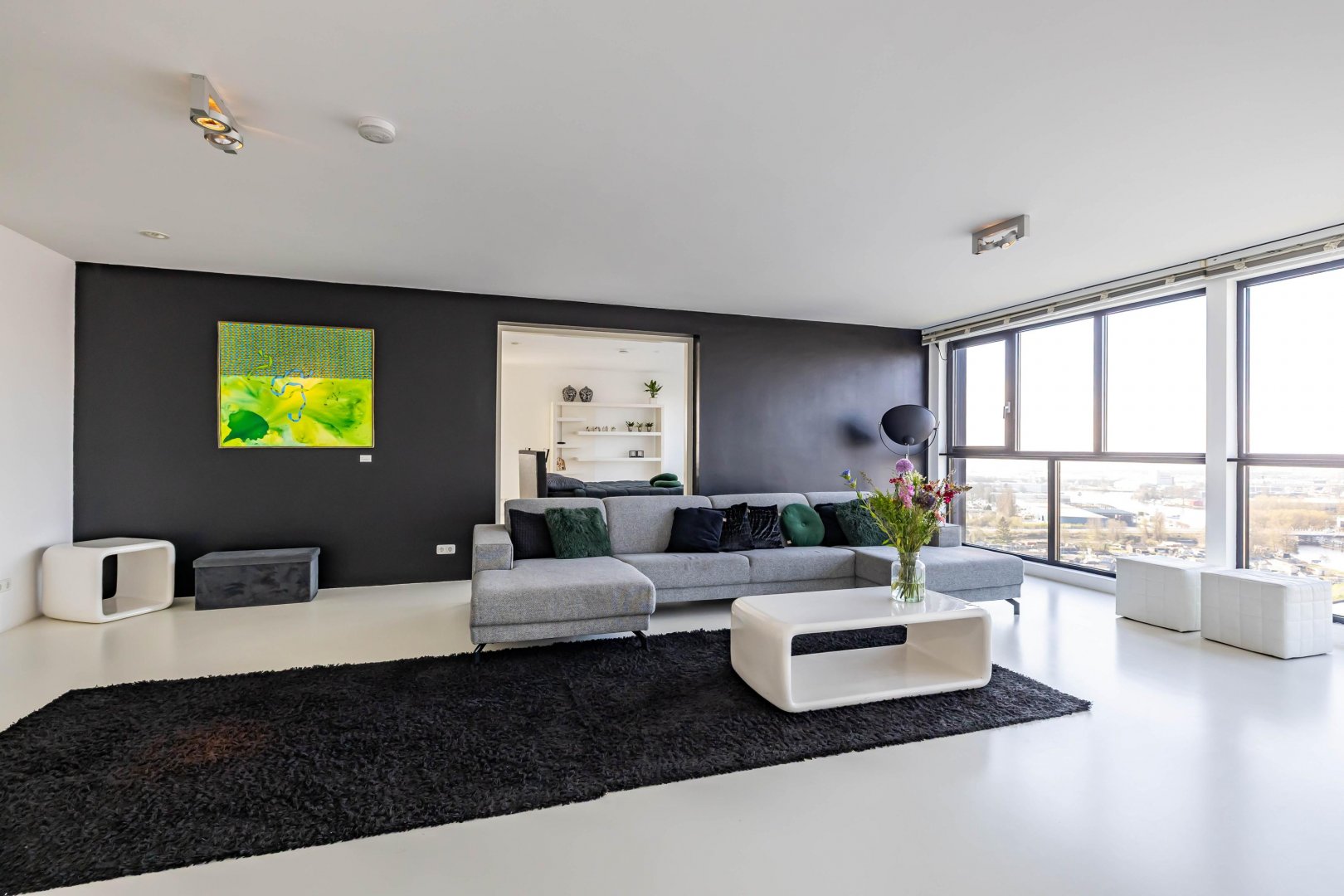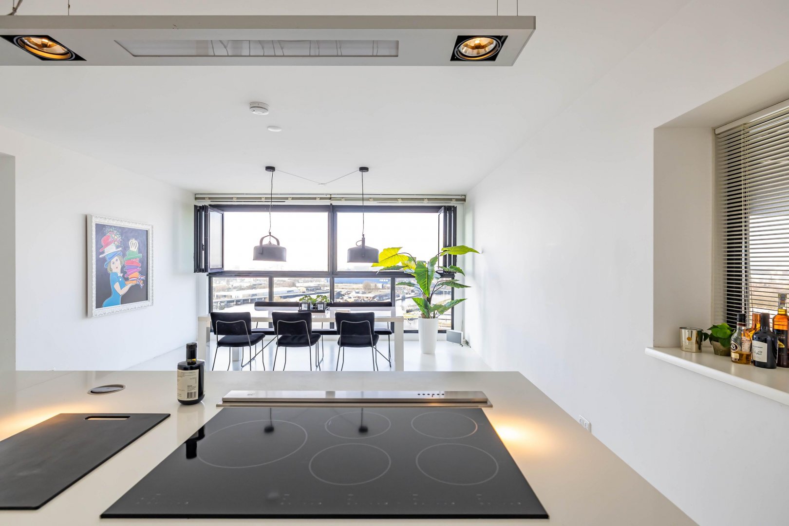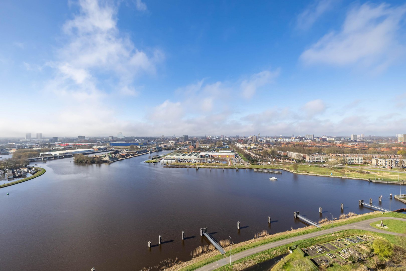 Via elegante taatsdeuren betreedt u de royale woonruimte, waar direct het indrukwekkende uitzicht over Groningen de aandacht grijpt. De woonkamer en keuken vormen samen een harmonieus geheel, badend in natuurlijk licht dankzij de grote raampartijen. Wat deze ruimte extra bijzonder maakt, zijn de harmonicaramen aan de bovenzijde, die zich openen tot een inpandig balkon—een subtiele, maar onweerstaanbare manier om buiten naar binnen te halen. Hier voelt u de frisse lucht, hoort u de stad op afstand en ervaart u een ongekende vrijheid, hoog boven het maaiveld.