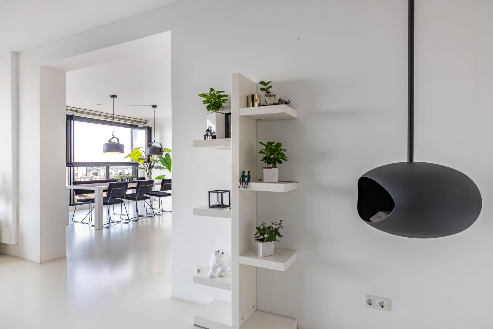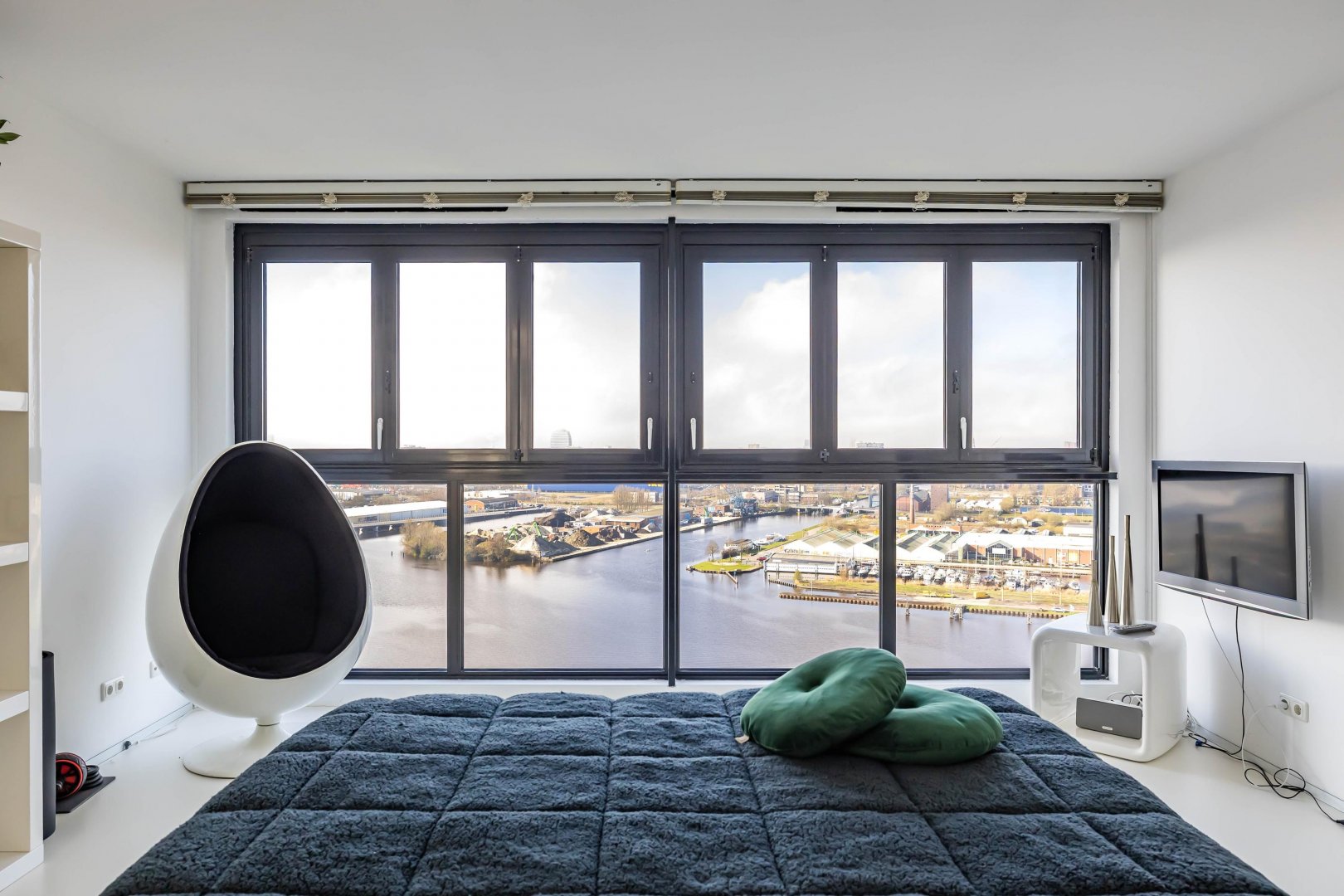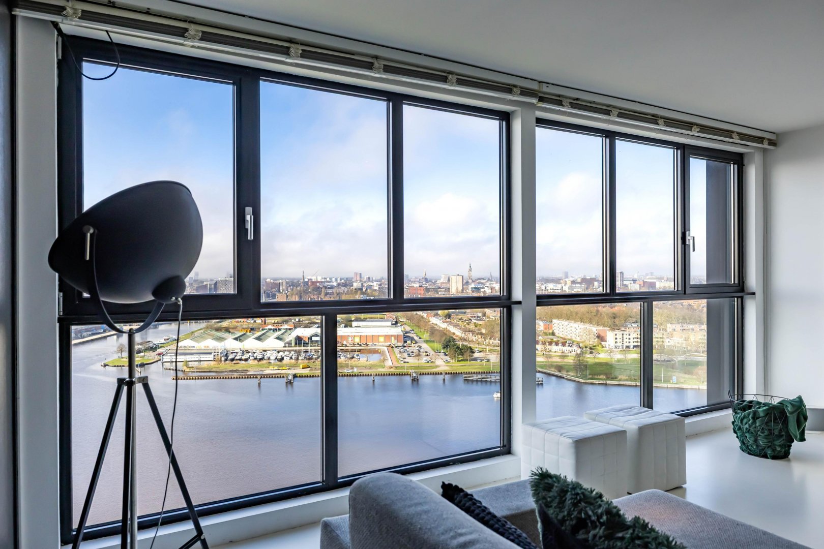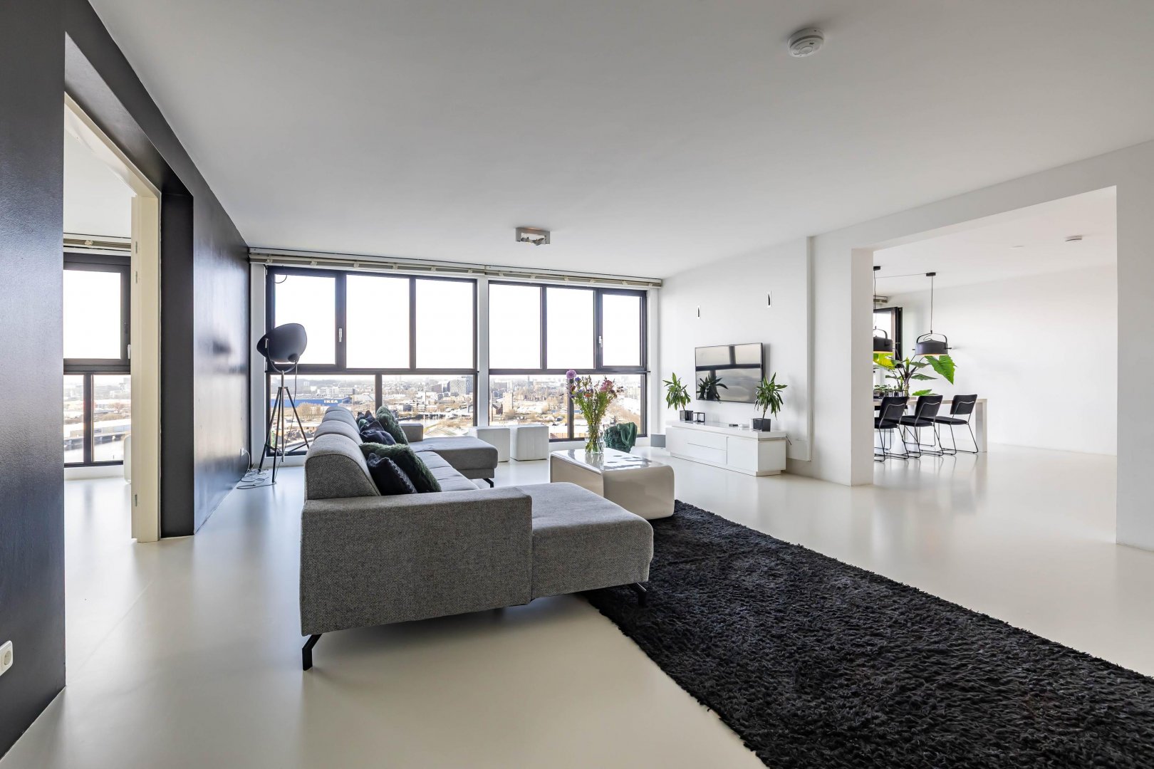 Via elegante taatsdeuren betreedt u de royale woonruimte, waar direct het indrukwekkende uitzicht over Groningen de aandacht grijpt. De woonkamer en keuken vormen samen een harmonieus geheel, badend in natuurlijk licht dankzij de grote raampartijen. Wat deze ruimte extra bijzonder maakt, zijn de harmonicaramen aan de bovenzijde, die zich openen tot een inpandig balkon—een subtiele, maar onweerstaanbare manier om buiten naar binnen te halen. Hier voelt u de frisse lucht, hoort u de stad op afstand en ervaart u een ongekende vrijheid, hoog boven het maaiveld.