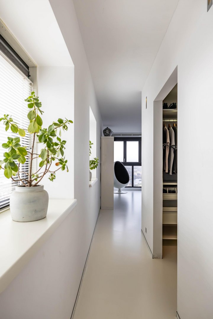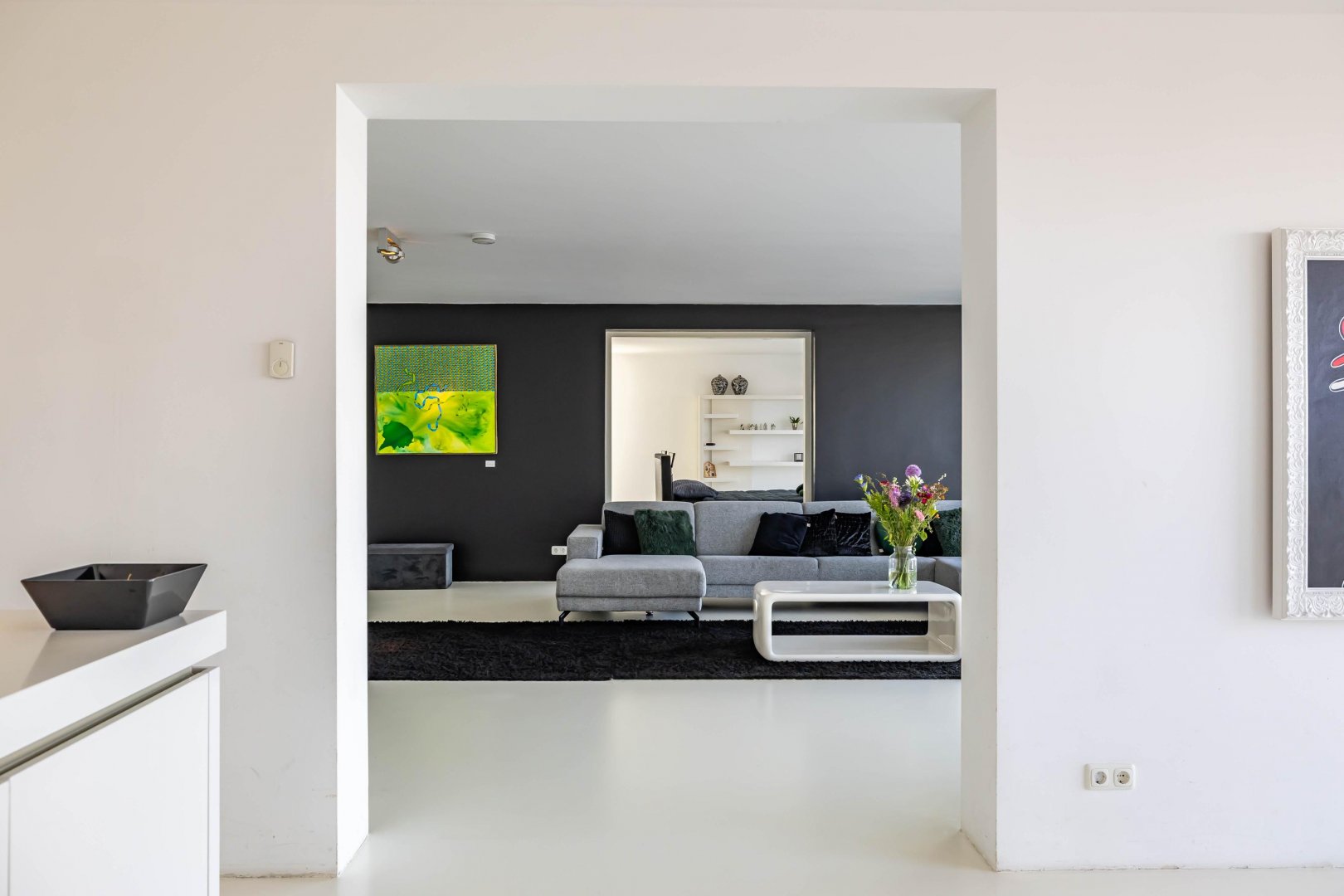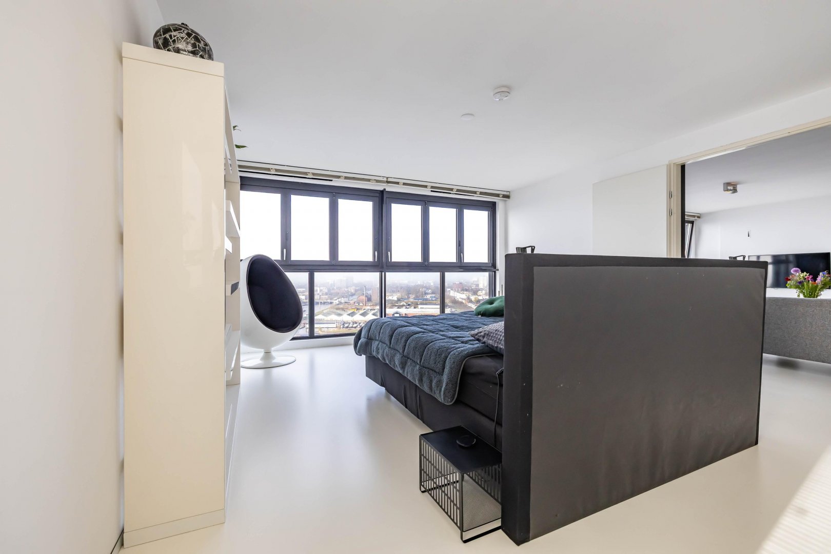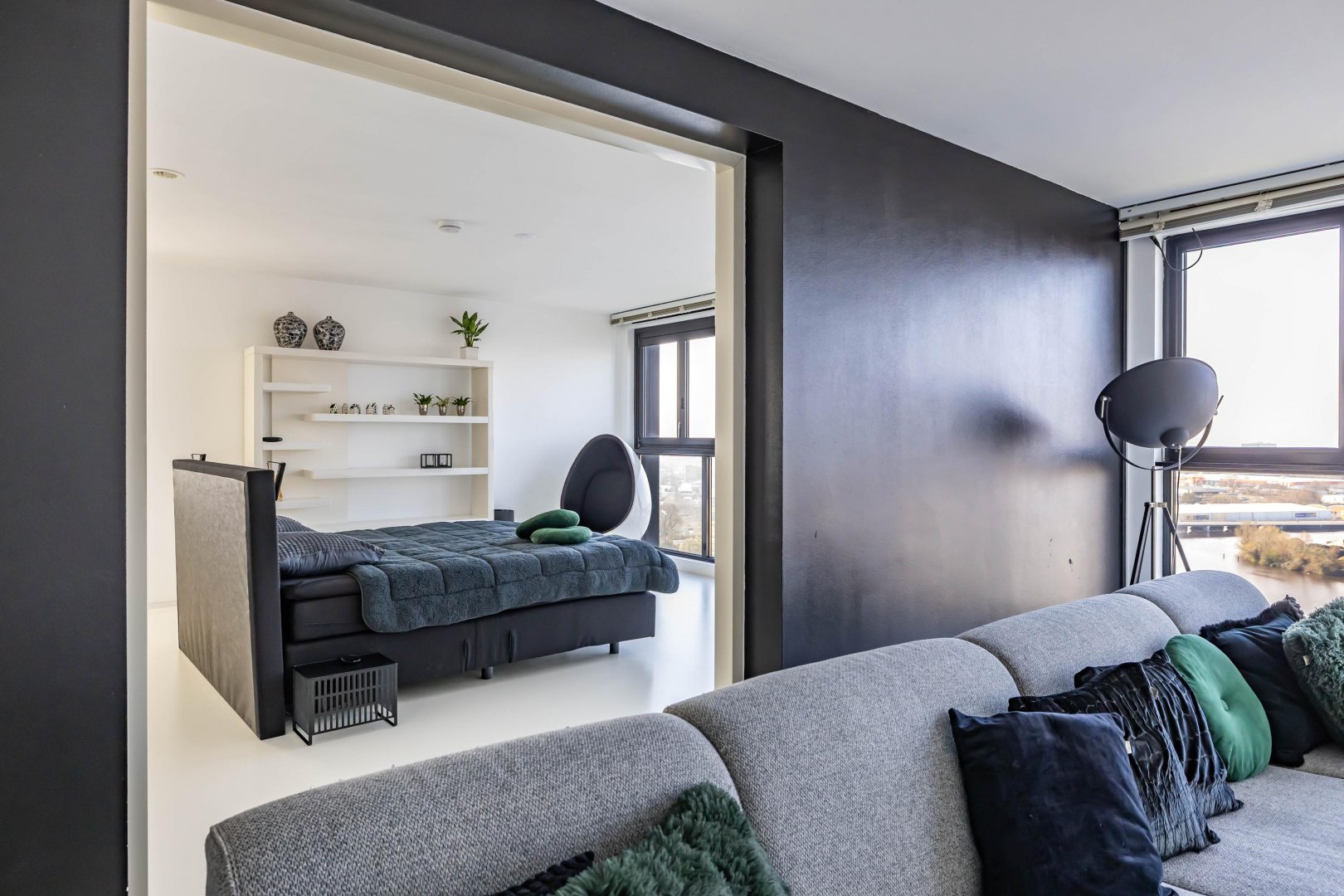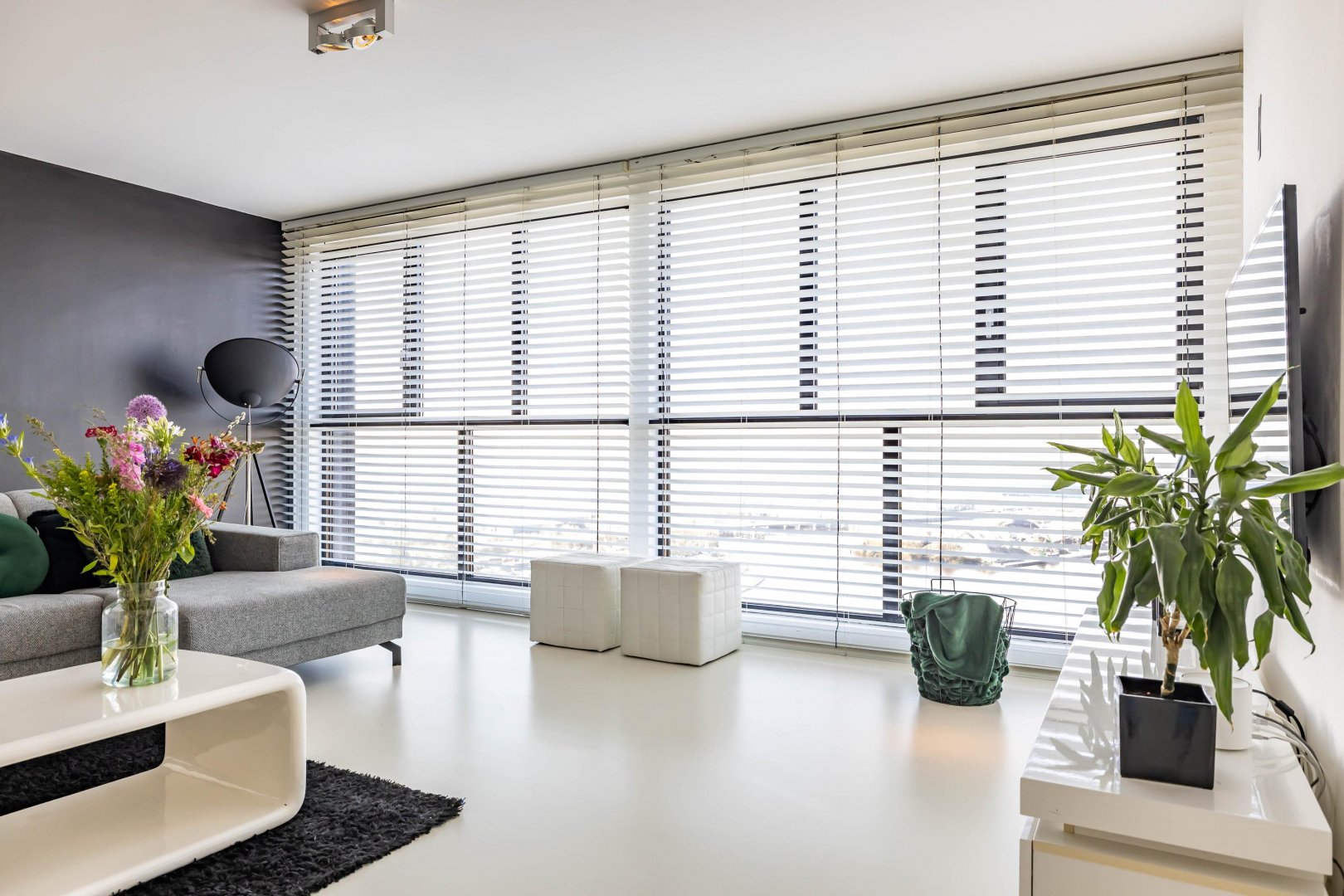 Via elegante taatsdeuren betreedt u de royale woonruimte, waar direct het indrukwekkende uitzicht over Groningen de aandacht grijpt. De woonkamer en keuken vormen samen een harmonieus geheel, badend in natuurlijk licht dankzij de grote raampartijen. Wat deze ruimte extra bijzonder maakt, zijn de harmonicaramen aan de bovenzijde, die zich openen tot een inpandig balkon—een subtiele, maar onweerstaanbare manier om buiten naar binnen te halen. Hier voelt u de frisse lucht, hoort u de stad op afstand en ervaart u een ongekende vrijheid, hoog boven het maaiveld.