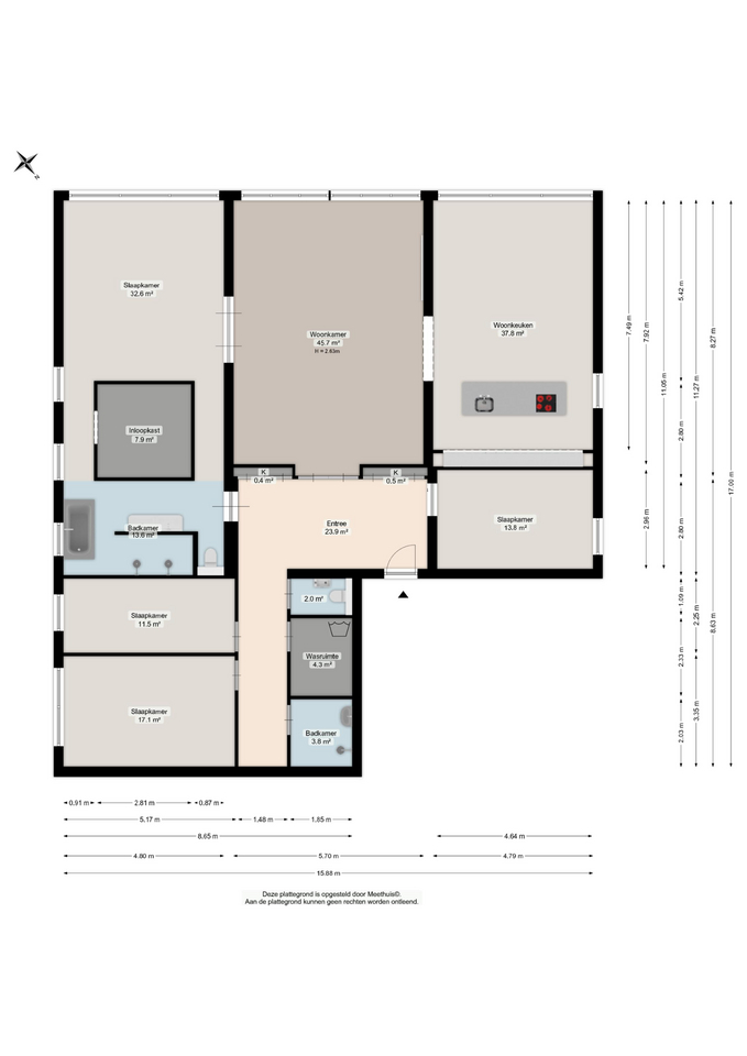 Verder beschikt het penthouse over nog eens twee ruime slaapkamers, elk met voldoende licht en mogelijkheden voor een eigen invulling. De tweede badkamer is praktisch en verzorgd, voorzien van een wastafel en een inloopdouche—ideaal voor dagelijks gebruik. De hoofdbadkamer daarentegen is luxueus uitgevoerd en vormt een ware wellnessruimte, waar u zich kunt terugtrekken en ontspannen in alle rust.