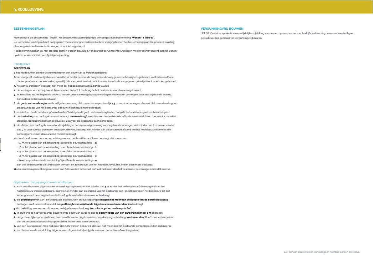 Door LYVR Architecten uit Haren is een zogeheten kavelpaspoort opgesteld dat inzicht biedt in de spelregels die gelden voor dit perceel. In een gesprek over deze kavel nemen we dit graag met u door. Eén van de weinige kansen om aan de zuidzijde van Groningen uw eigen droomvilla te bouwen!
