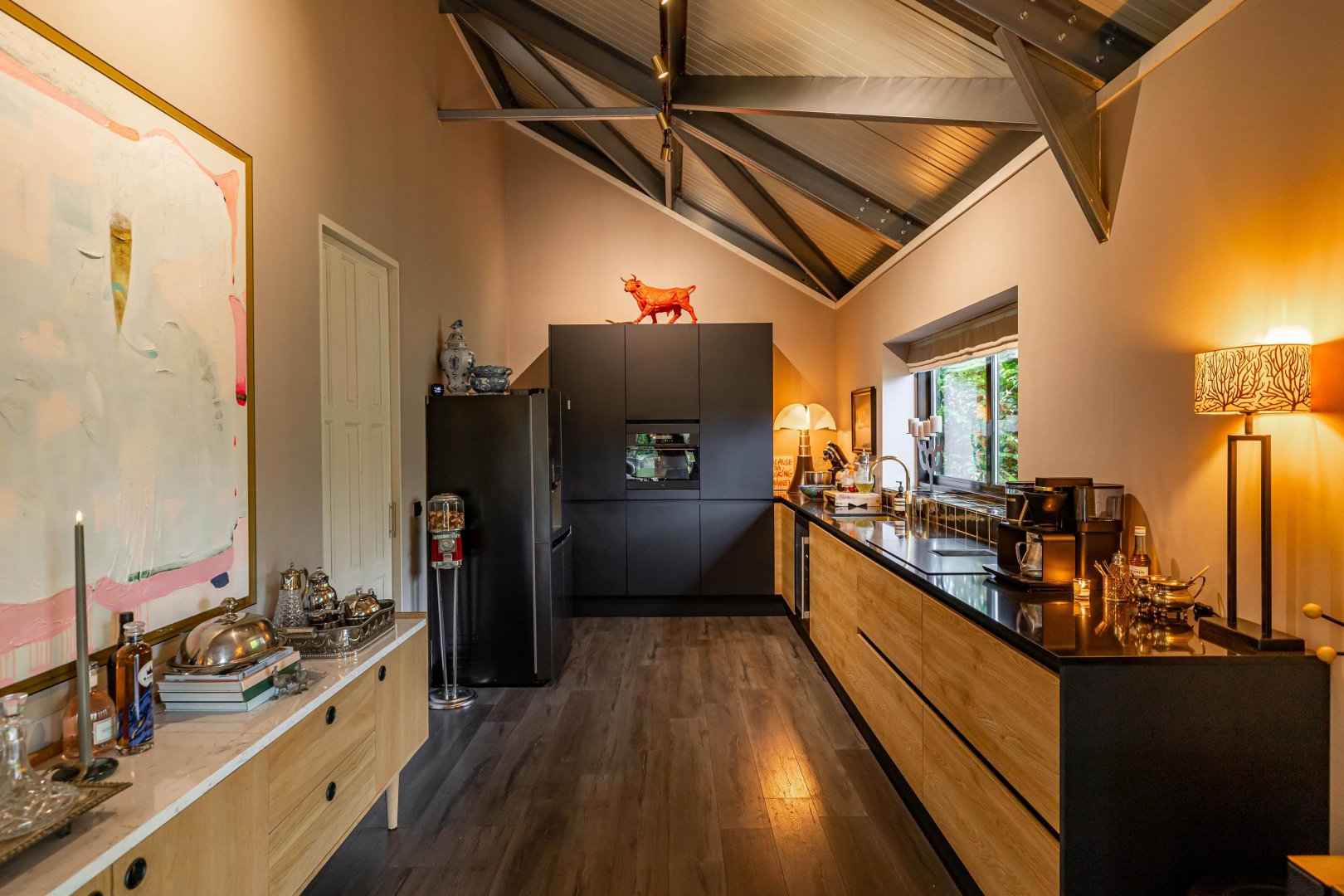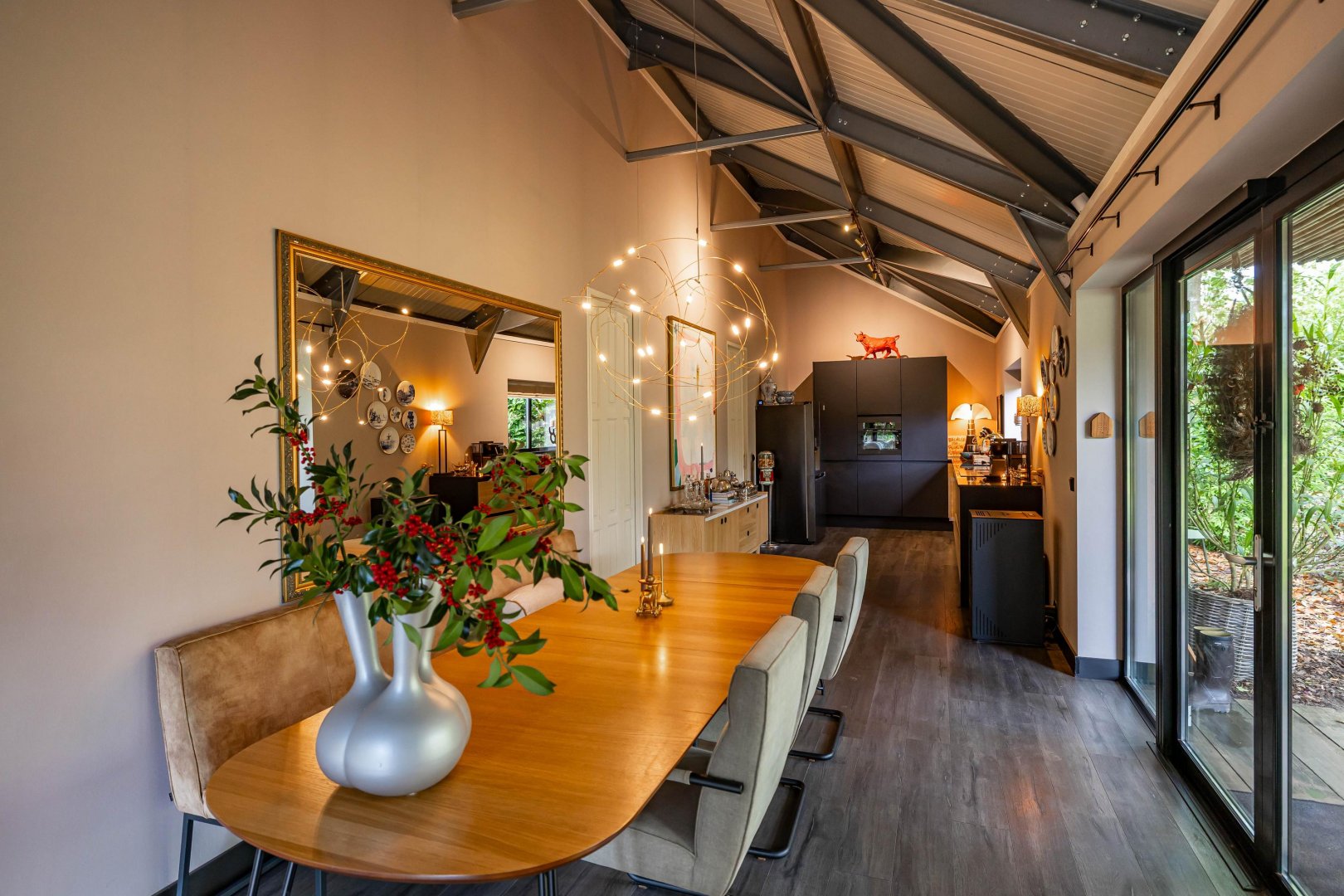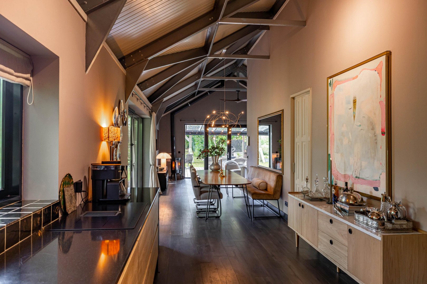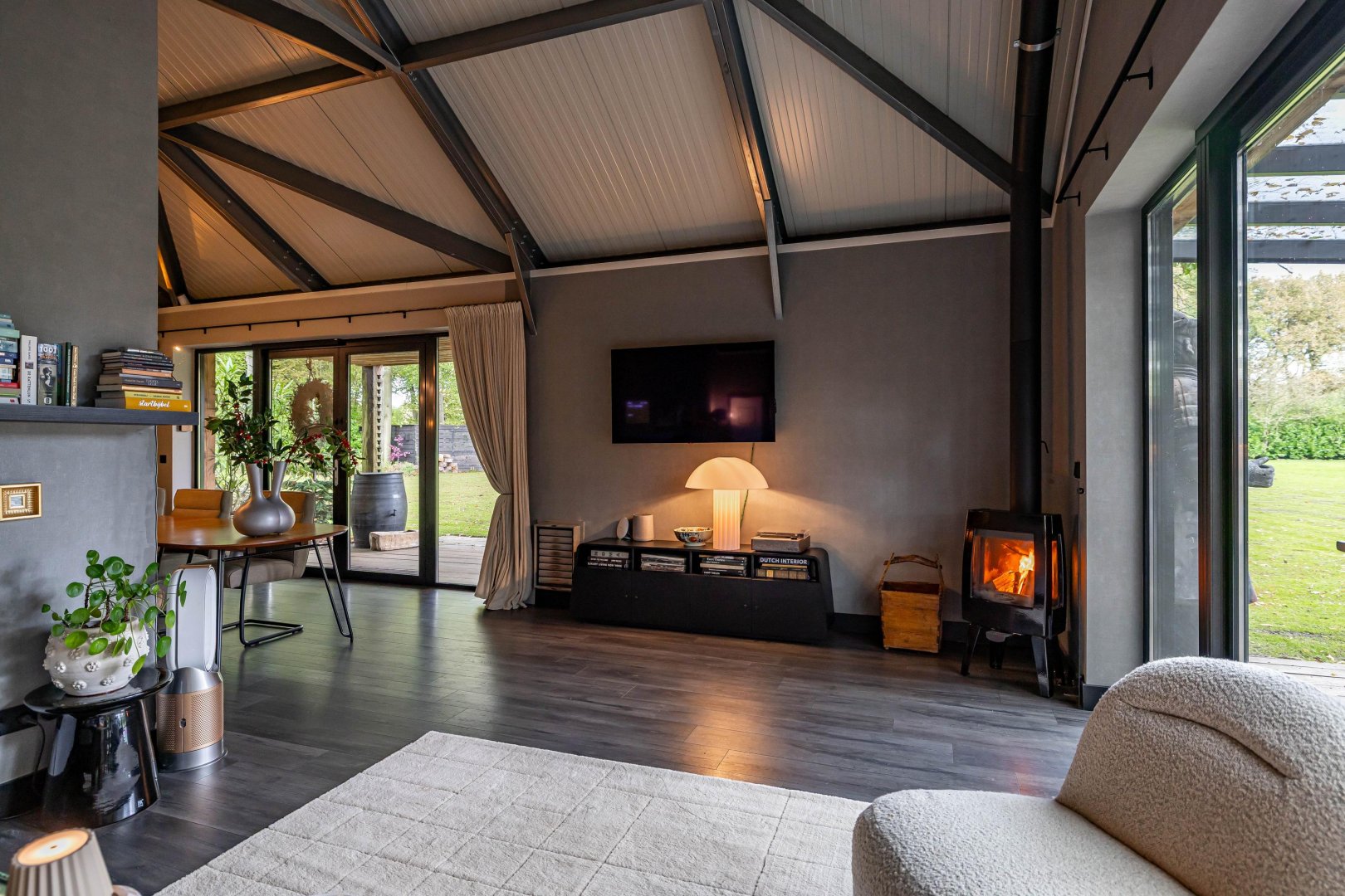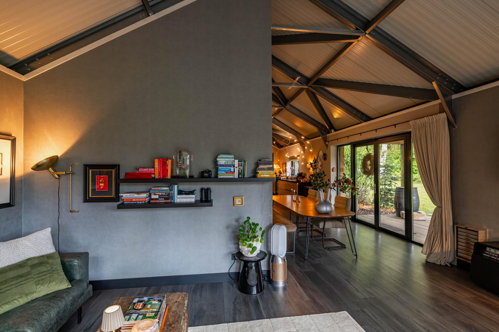 Op een mooie, verscholen plek, aan het zicht van de woonboerderij onttrokken, staat het fraaie bijgebouw. Dit heeft de uitstraling van een moderne schuurwoning met karakter en licht. Middels de overkapte entree stap je direct de heerlijk ruime en lichte living met open keuken van 53 m² binnen. Het plafond is grotendeels tot in de nok open, waardoor een ruimtelijk gevoel ontstaat. De grote zuidgerichte pui met openslaande deuren zorgt voor een directe verbinding met de tuin. De keuken is modern en voorzien van inbouwapparatuur.