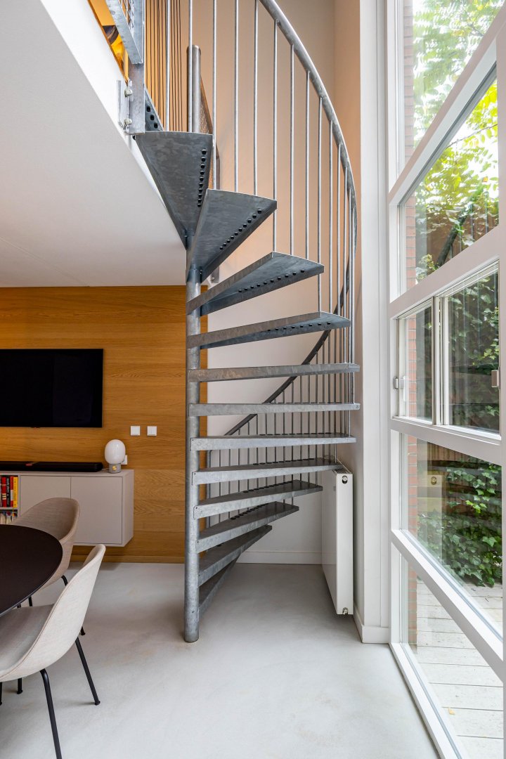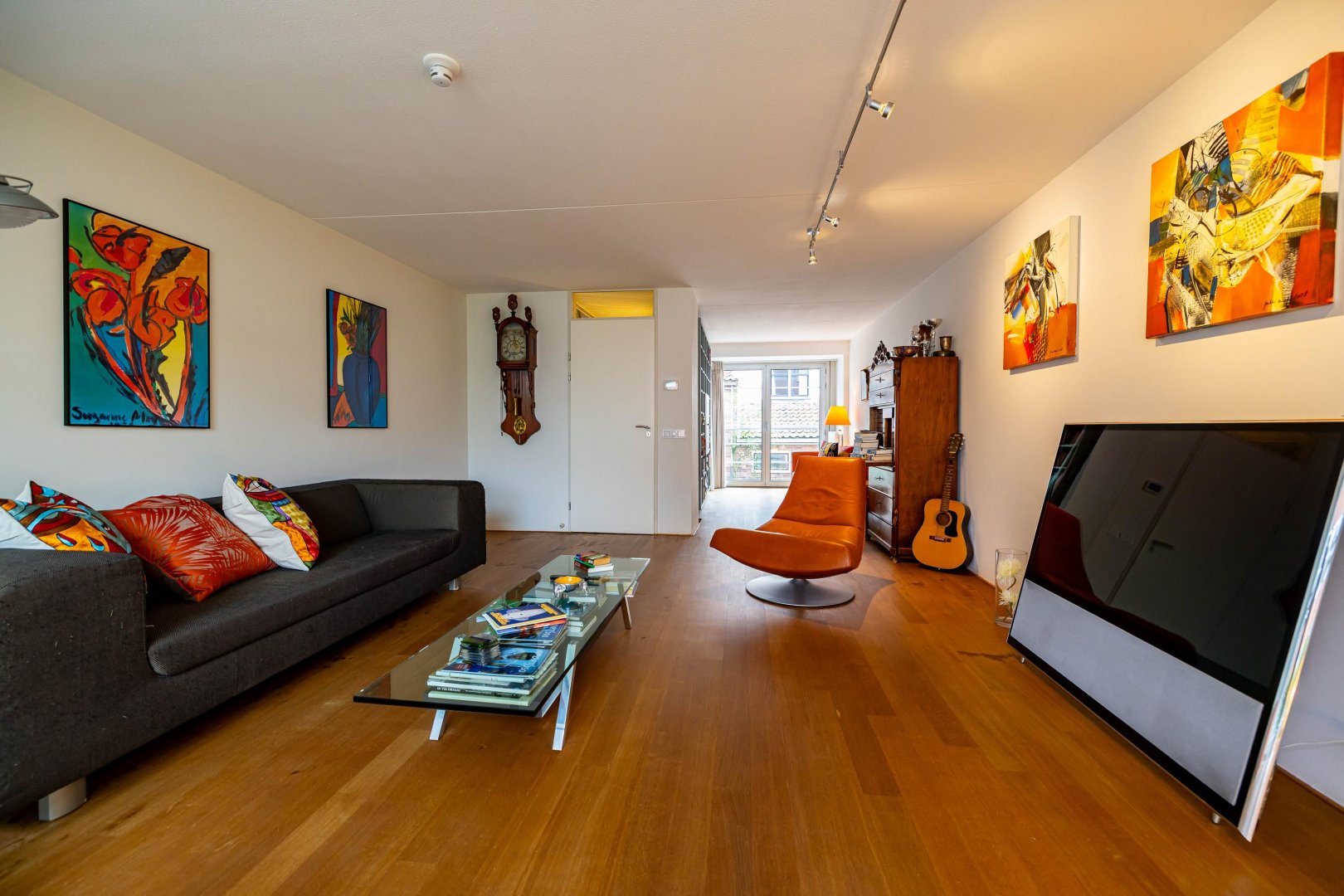 Achter in de keuken gaat u via een stalen 'industrial' wenteltrap naar de eerste verdieping door de vide en komt u in de woonkamer in L- vorm van circa 37 m². De woonkamer is voorzien van een eiken houtenvloer. Aan de straatzijde van de woonkamer vindt u twee grote openslaande deuren van het Frans balkon. Op deze verdieping ook de hal, meterkast en hoofdentree.