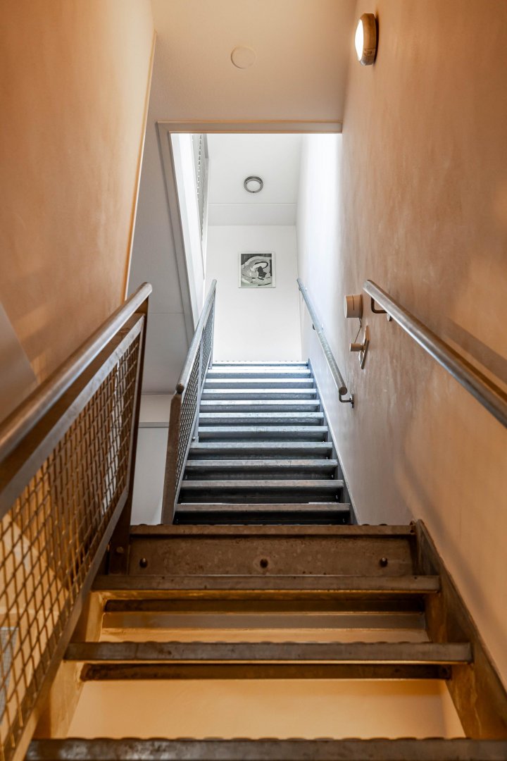 Bij het binnen gaan kunt u kiezen tussen de deur op de begane grond naast de elektrische kantel-garagedeur of een trap omhoog naar de eigenlijke hoofdentree en de hal.