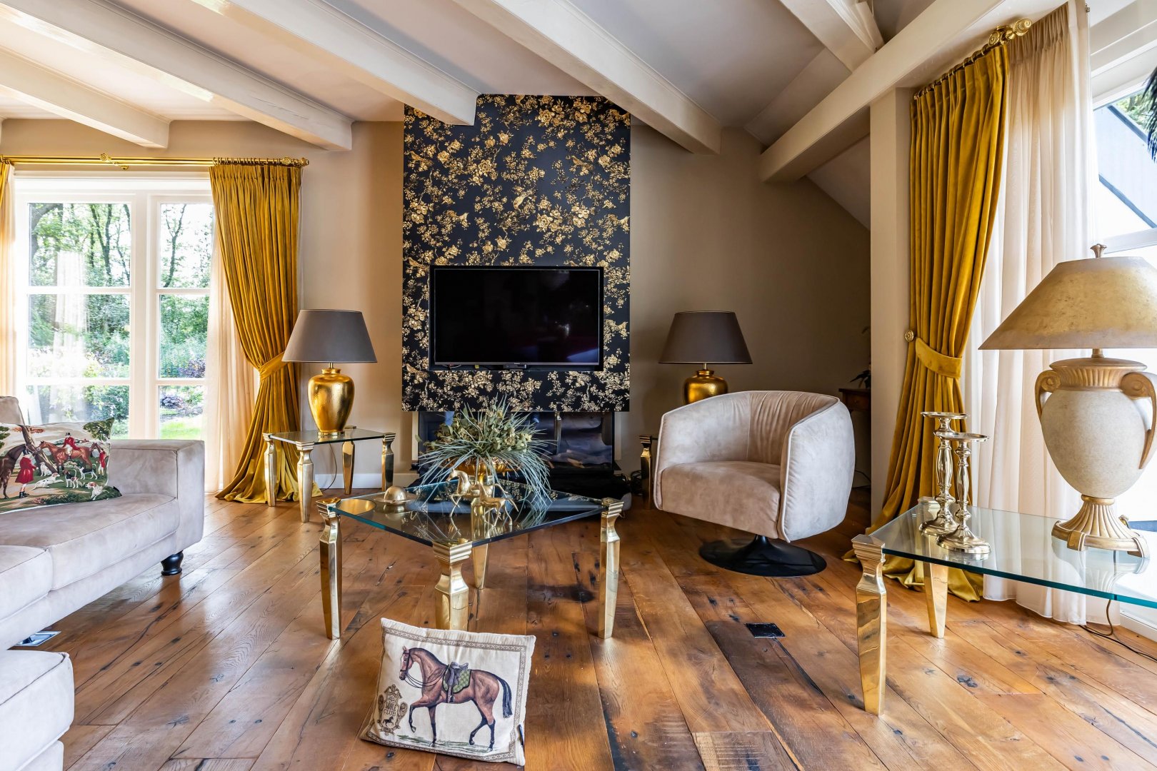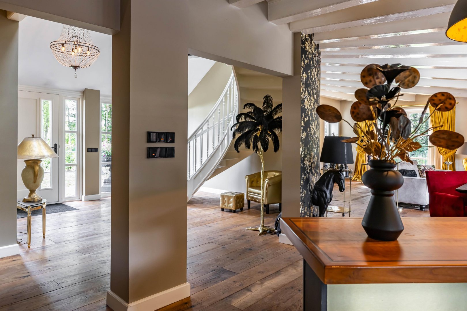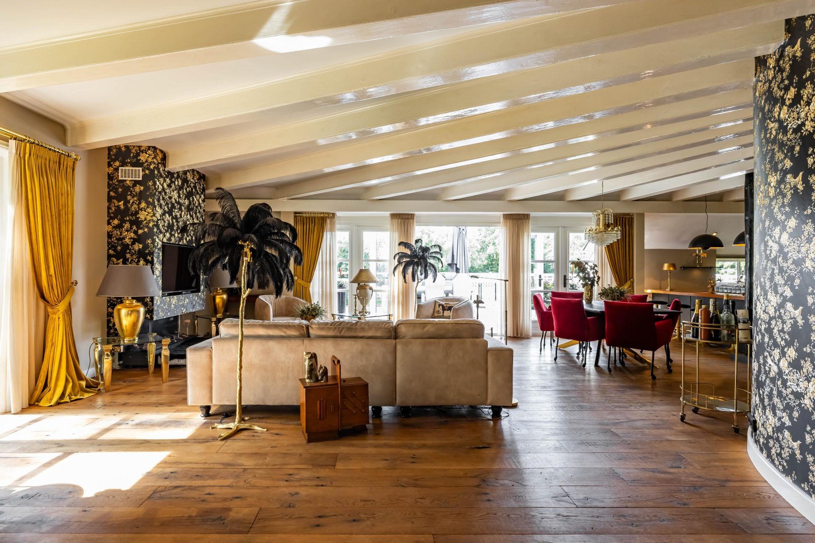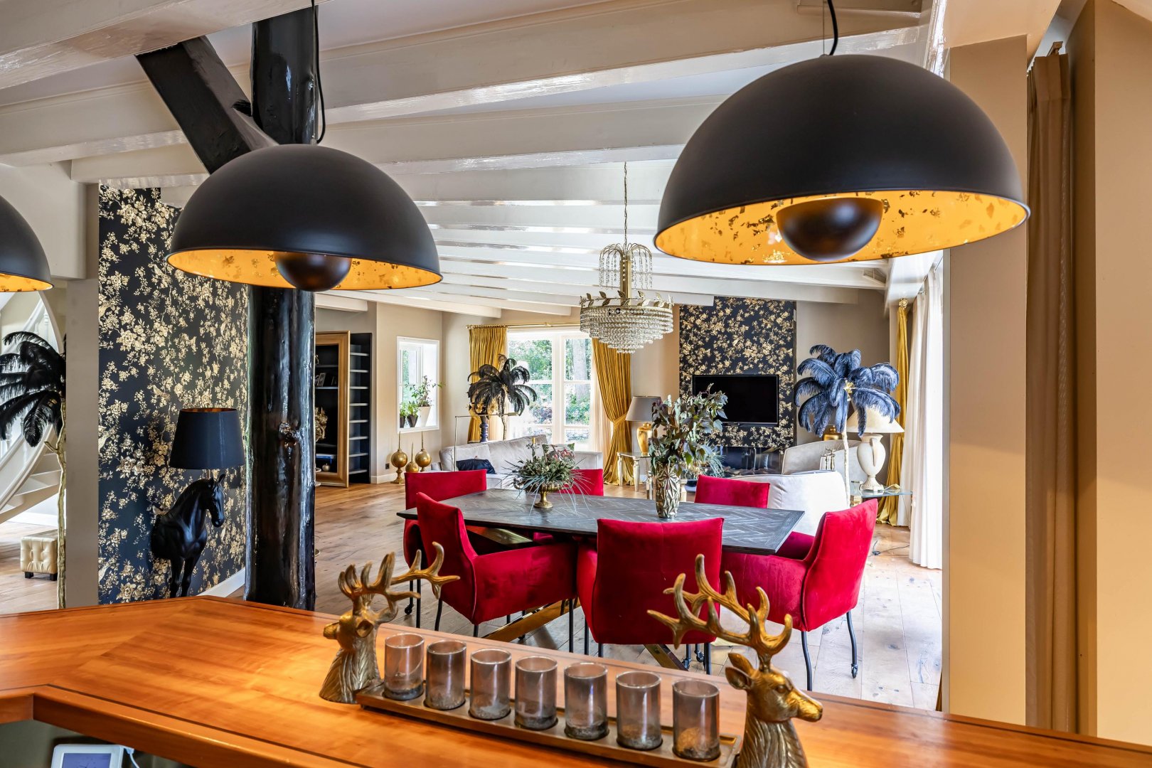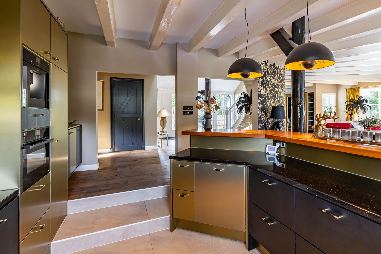 Direct bij binnenkomst in de uniek vormgegeven hal overvalt u dat gevoel van grandeur en luxe, terwijl de woonkamer met rondgelegde balken en haard een warme, landelijke sfeer heeft. De moderne, iets verlaagde open keuken met bar en diverse inbouwapparatuur, vormt het hart van het huis: perfect voor lange diners en sfeervolle avonden.