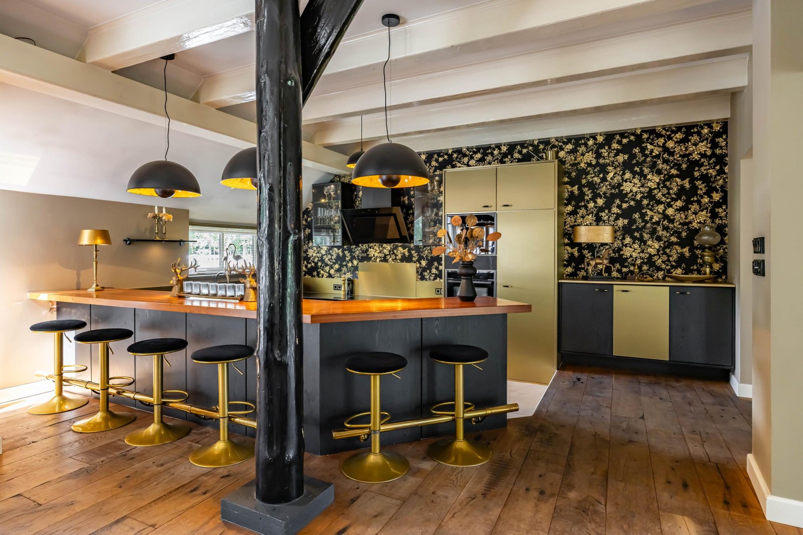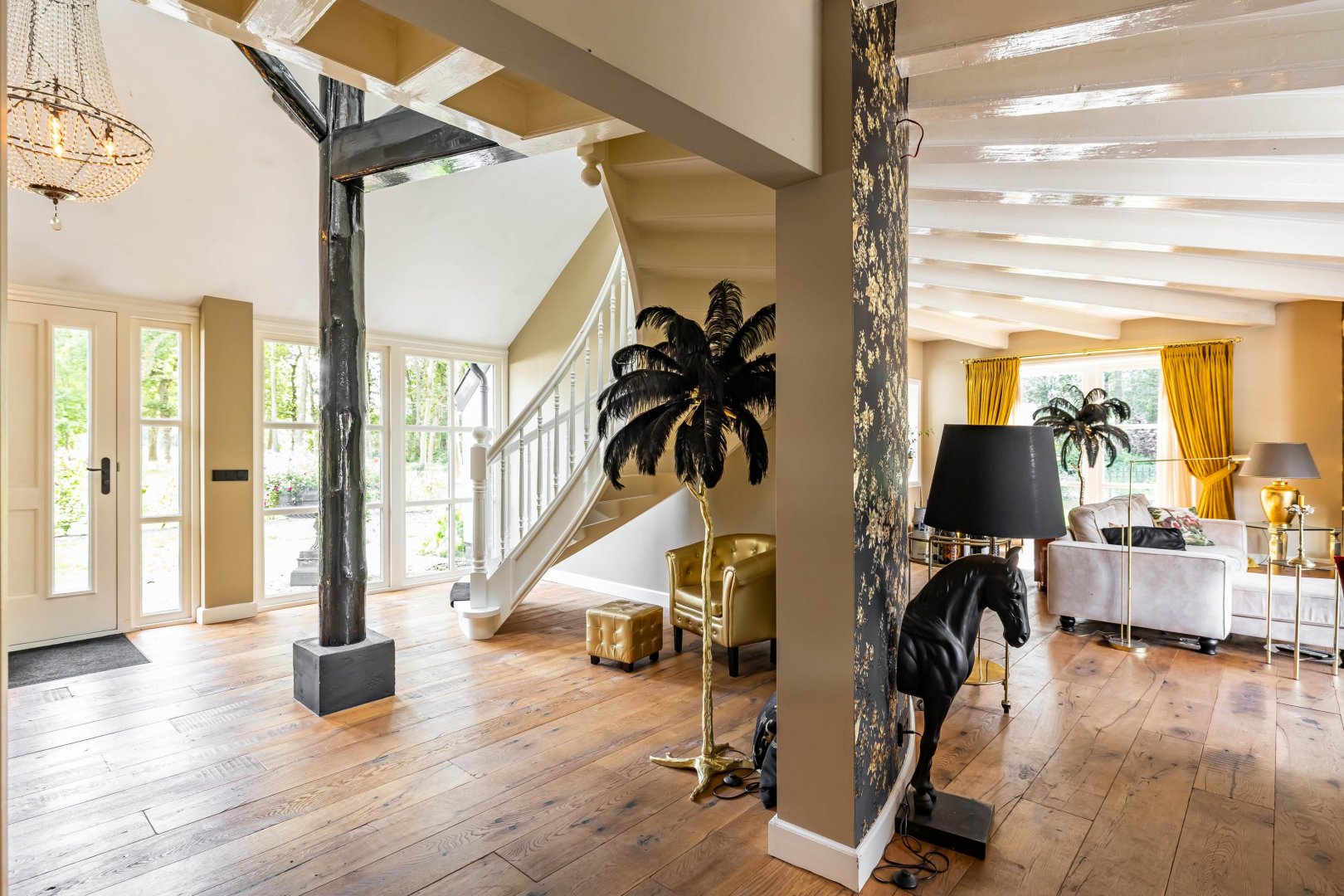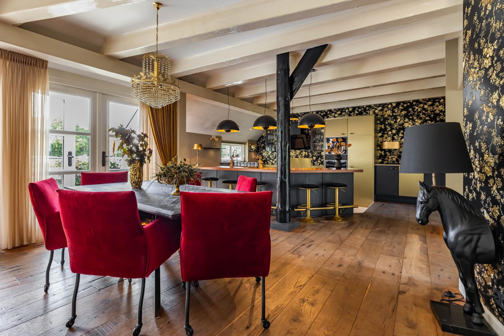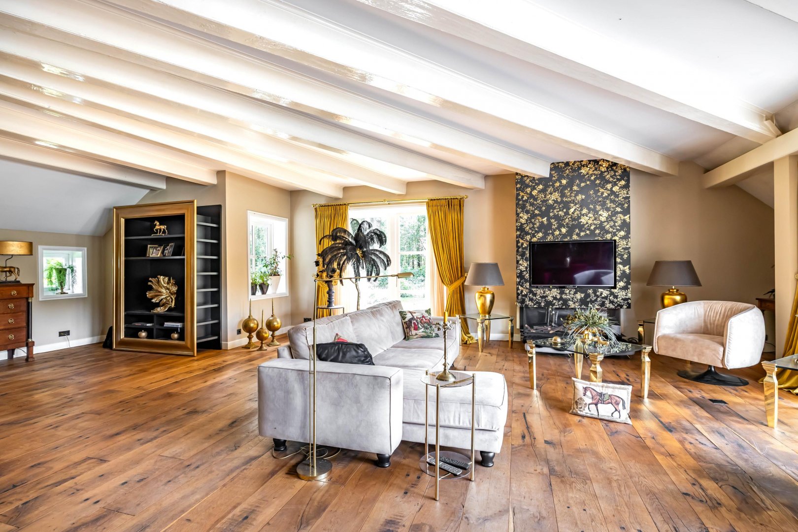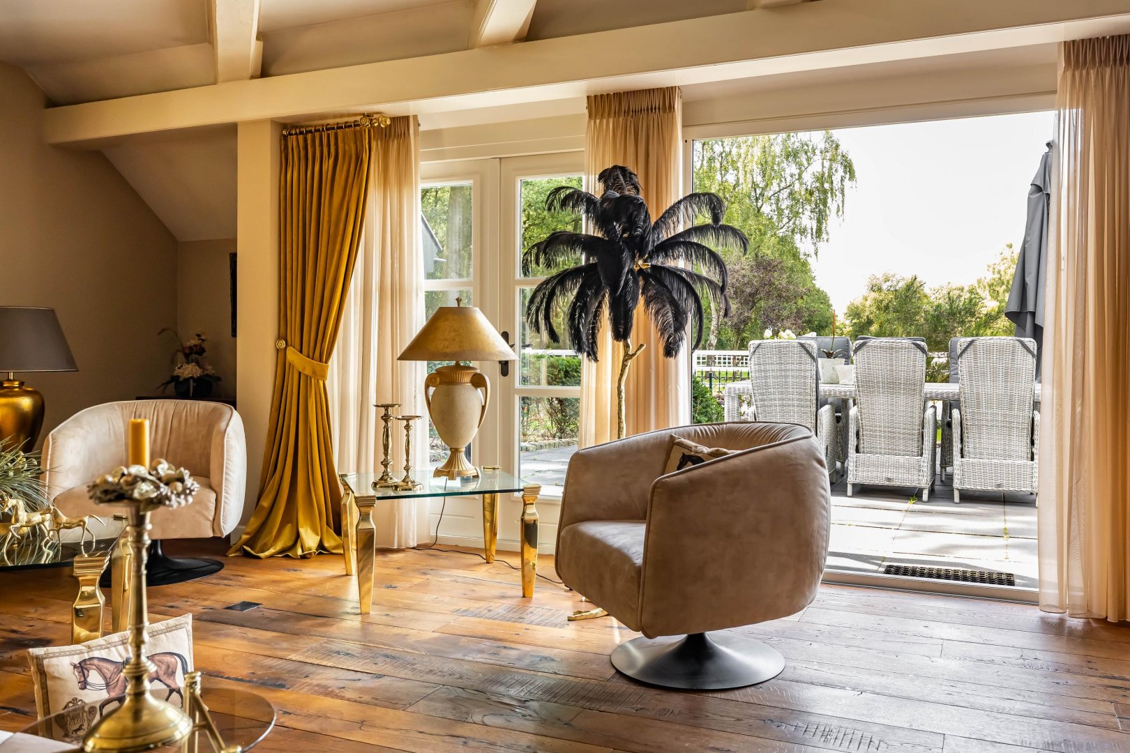 Direct bij binnenkomst in de uniek vormgegeven hal overvalt u dat gevoel van grandeur en luxe, terwijl de woonkamer met rondgelegde balken en haard een warme, landelijke sfeer heeft. De moderne, iets verlaagde open keuken met bar en diverse inbouwapparatuur, vormt het hart van het huis: perfect voor lange diners en sfeervolle avonden.