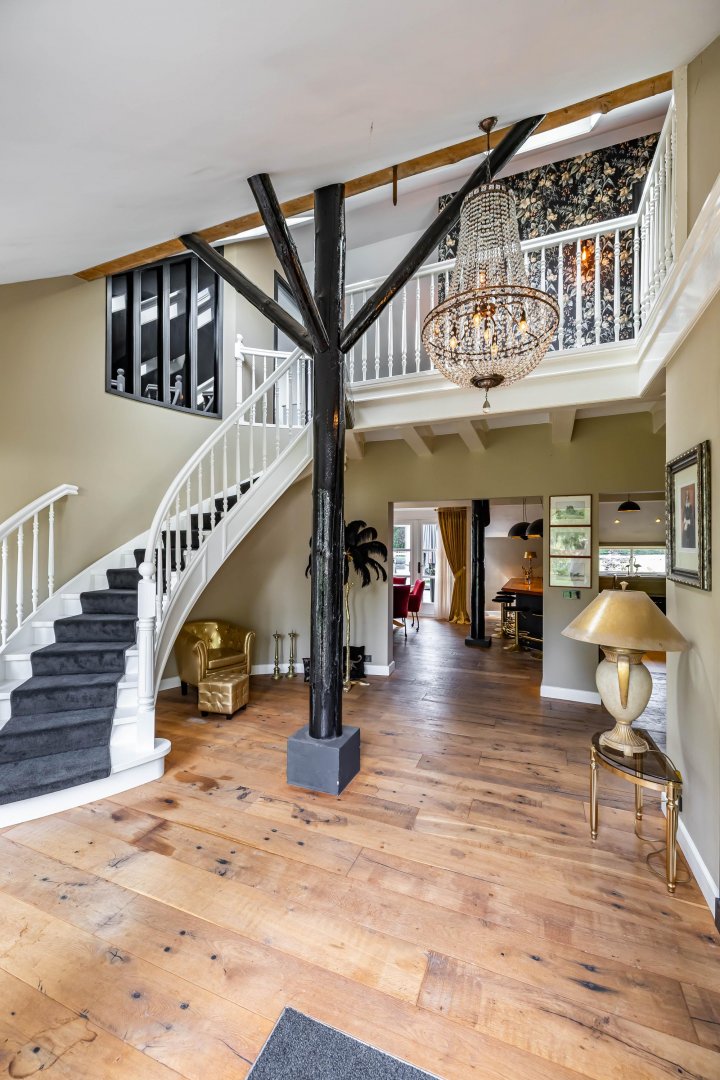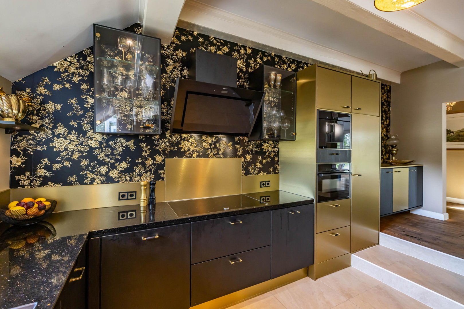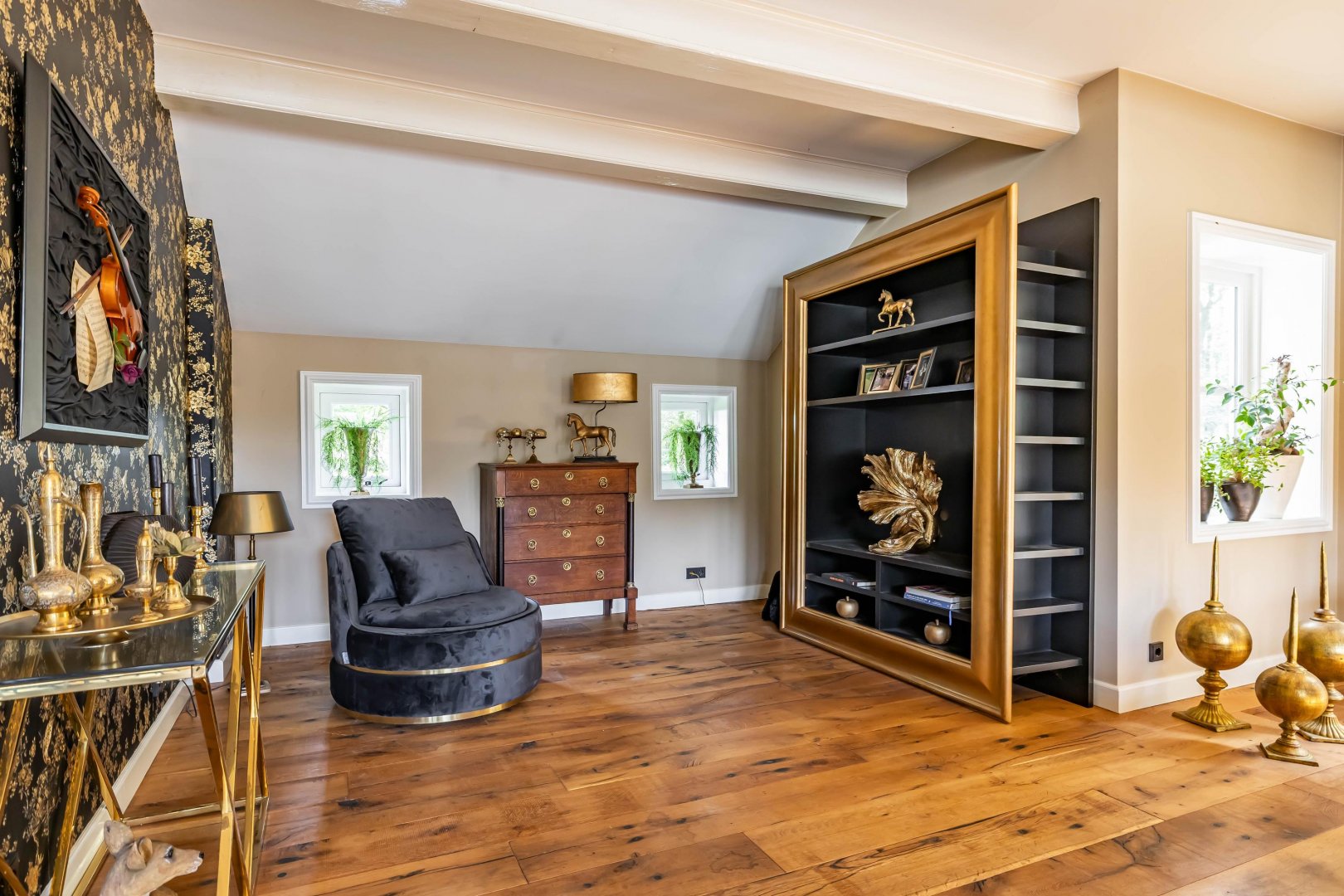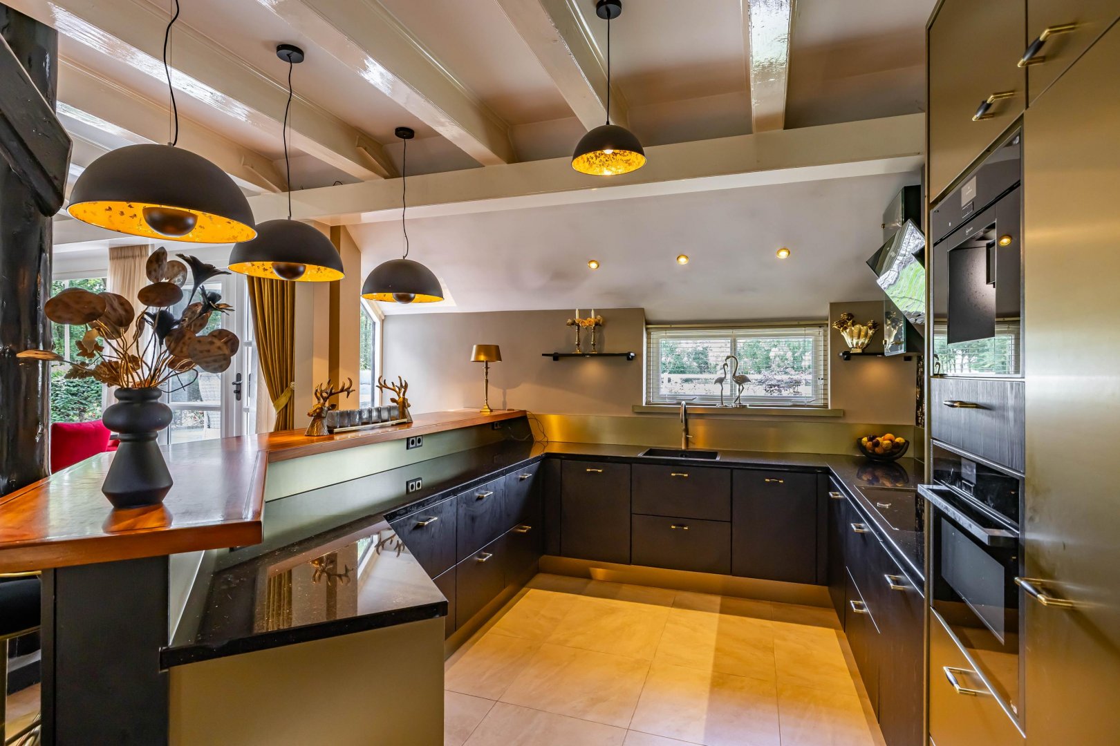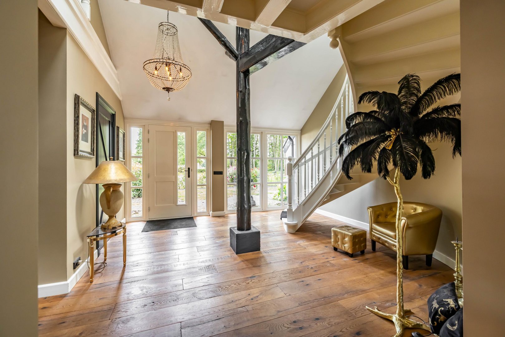 Direct bij binnenkomst in de uniek vormgegeven hal overvalt u dat gevoel van grandeur en luxe, terwijl de woonkamer met rondgelegde balken en haard een warme, landelijke sfeer heeft. De moderne, iets verlaagde open keuken met bar en diverse inbouwapparatuur, vormt het hart van het huis: perfect voor lange diners en sfeervolle avonden.