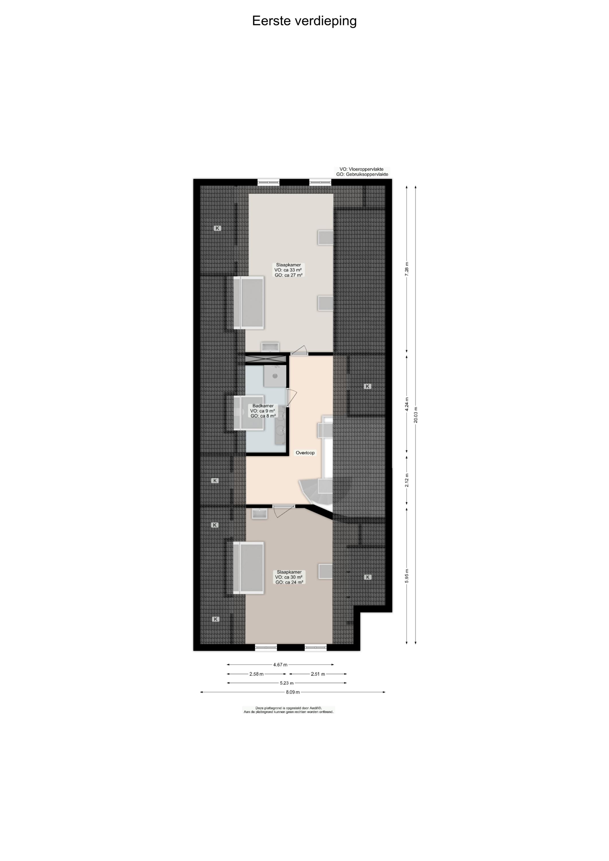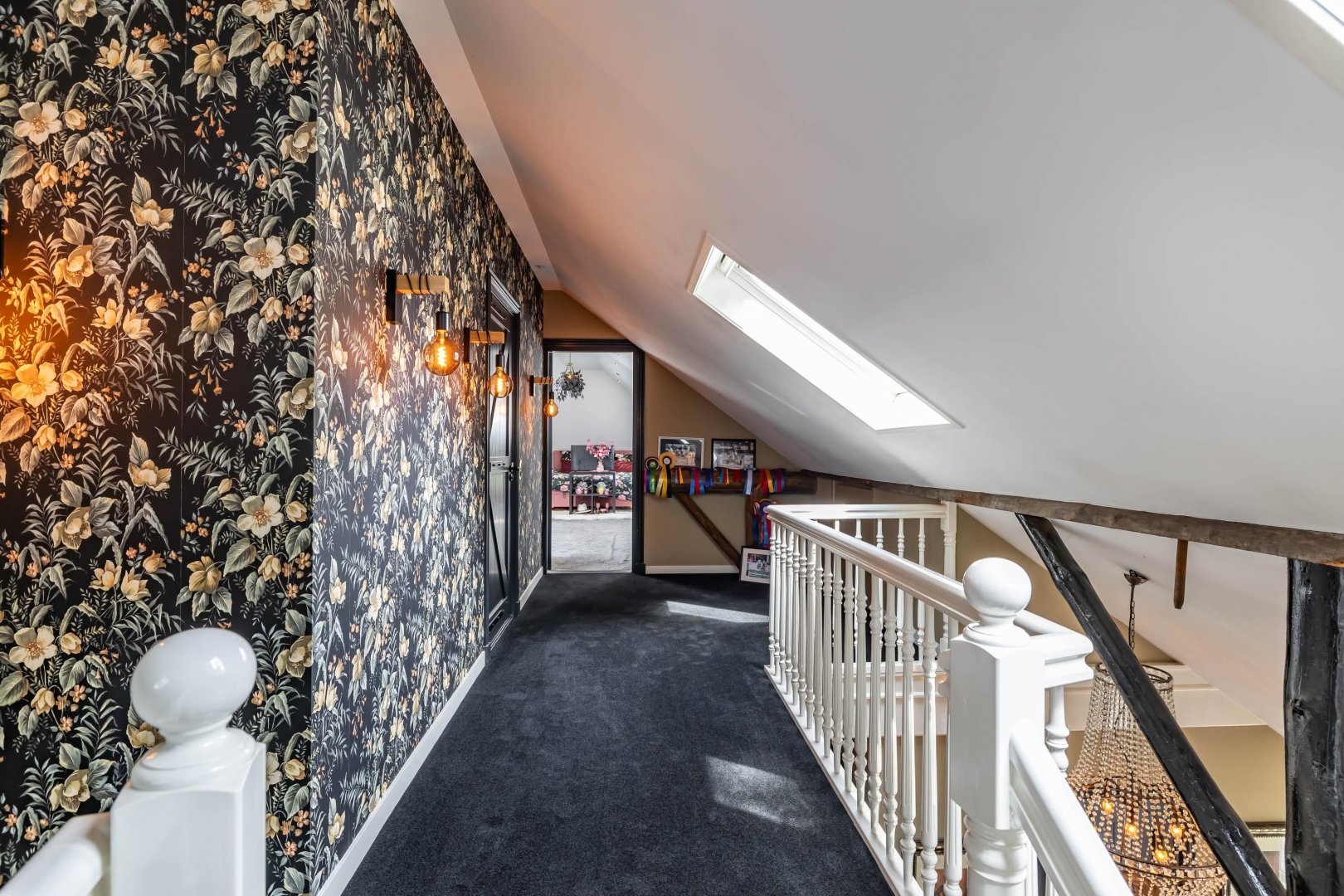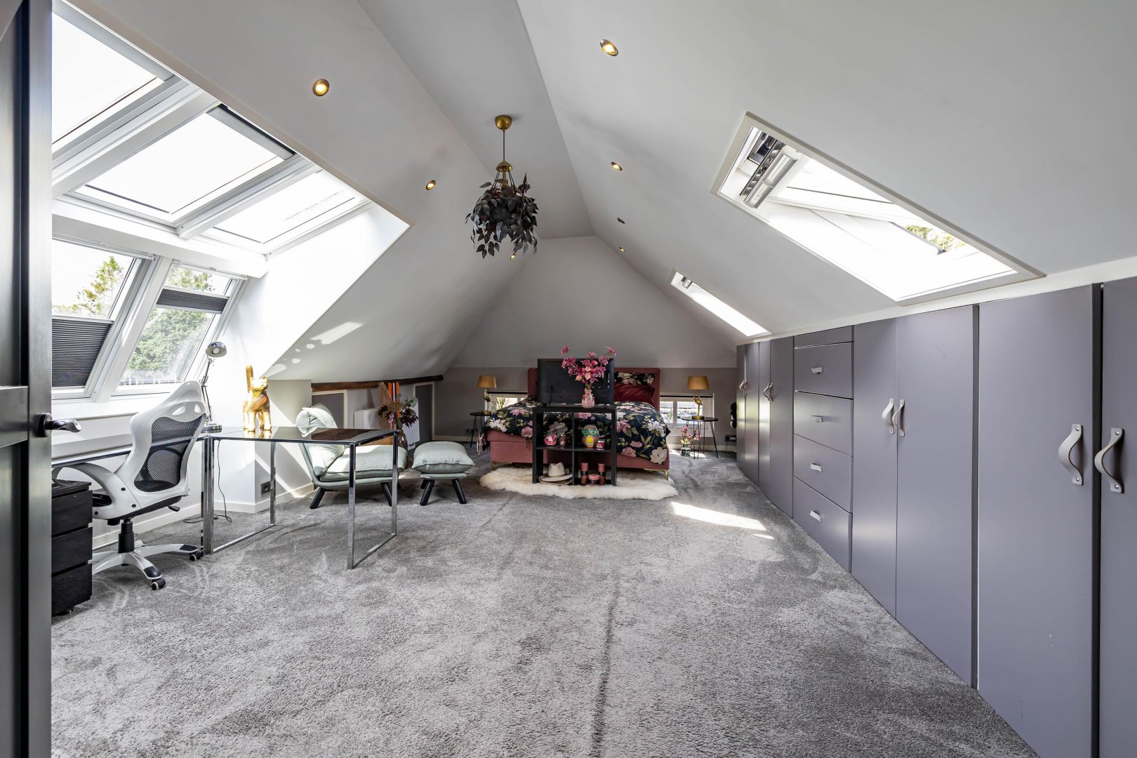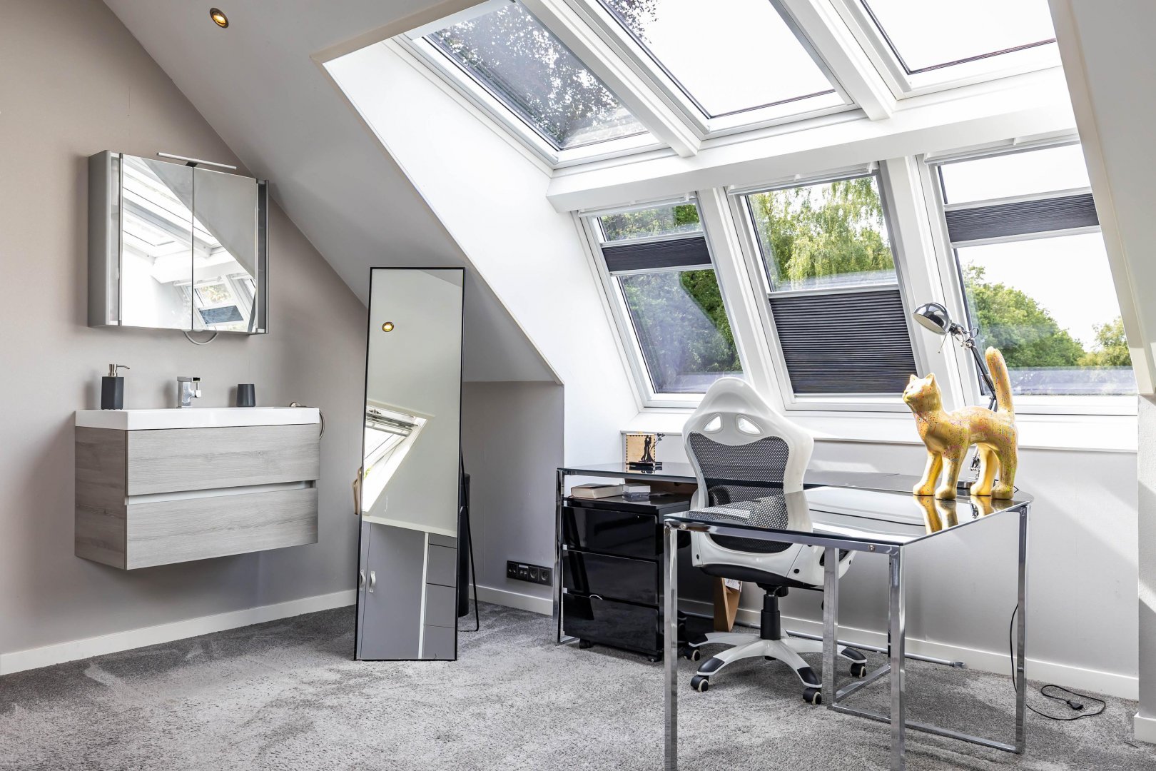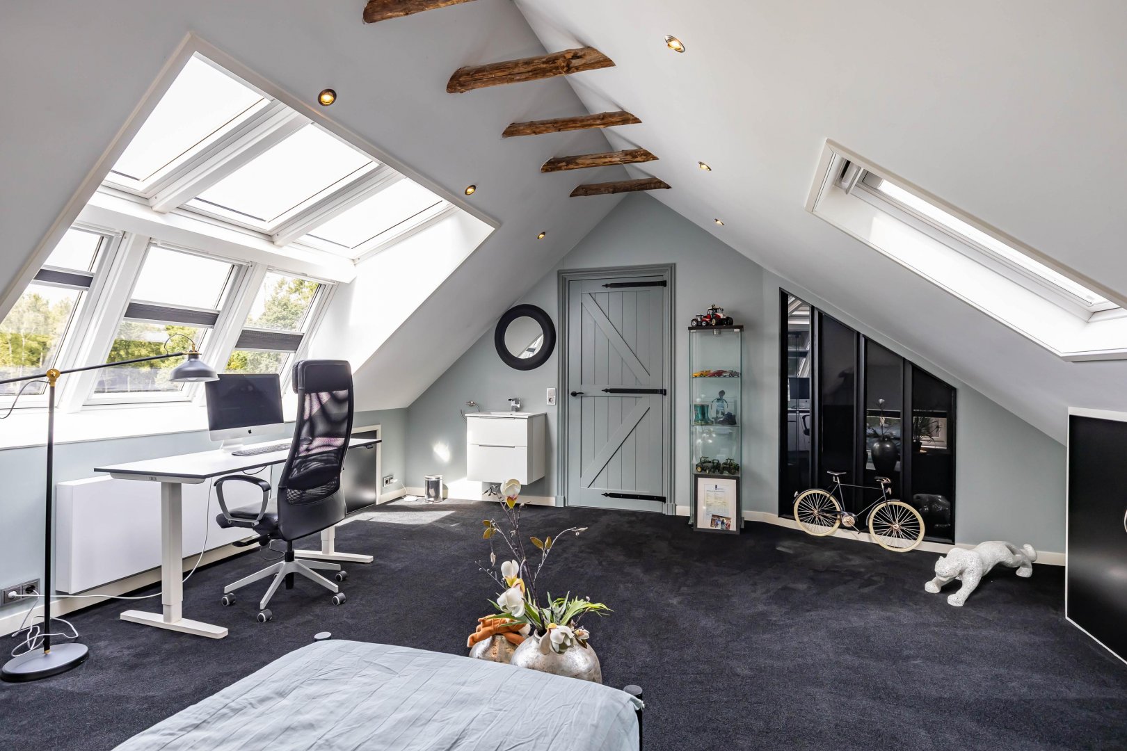 Via de ronde trap bereikt u de 1e etage. Fraai zijn oude gebinten in het ontwerp geïntegreerd. Op de etage bevinden zich twee uiterst royale slaapkamers met studiehoek; de Velux-dakkapel serre zorgt voor overvloedig daglicht. Tussen de kamers bevindt zich een tweede badkamer met landelijke uitstraling en is voorzien van wastafelmeubel, toilet en inloopdouche.