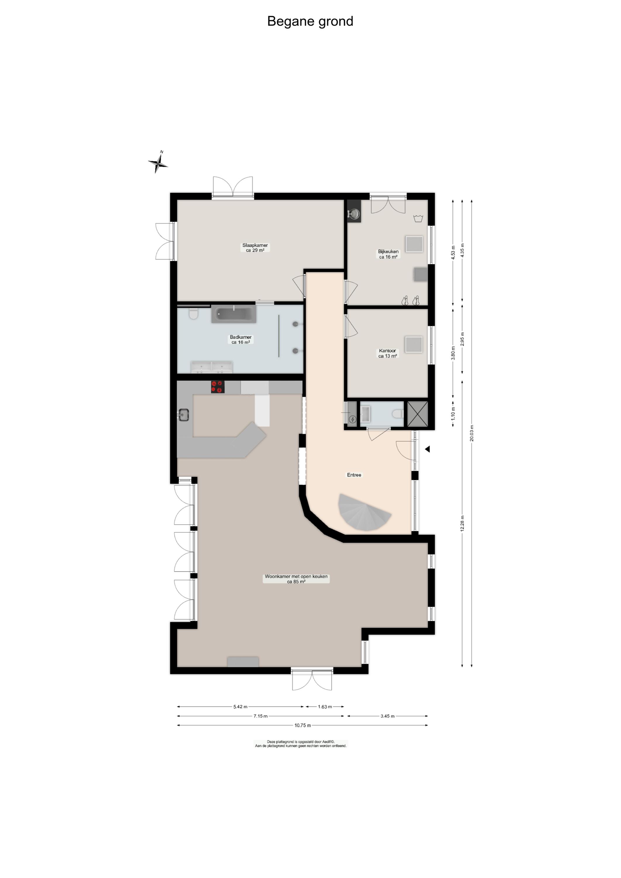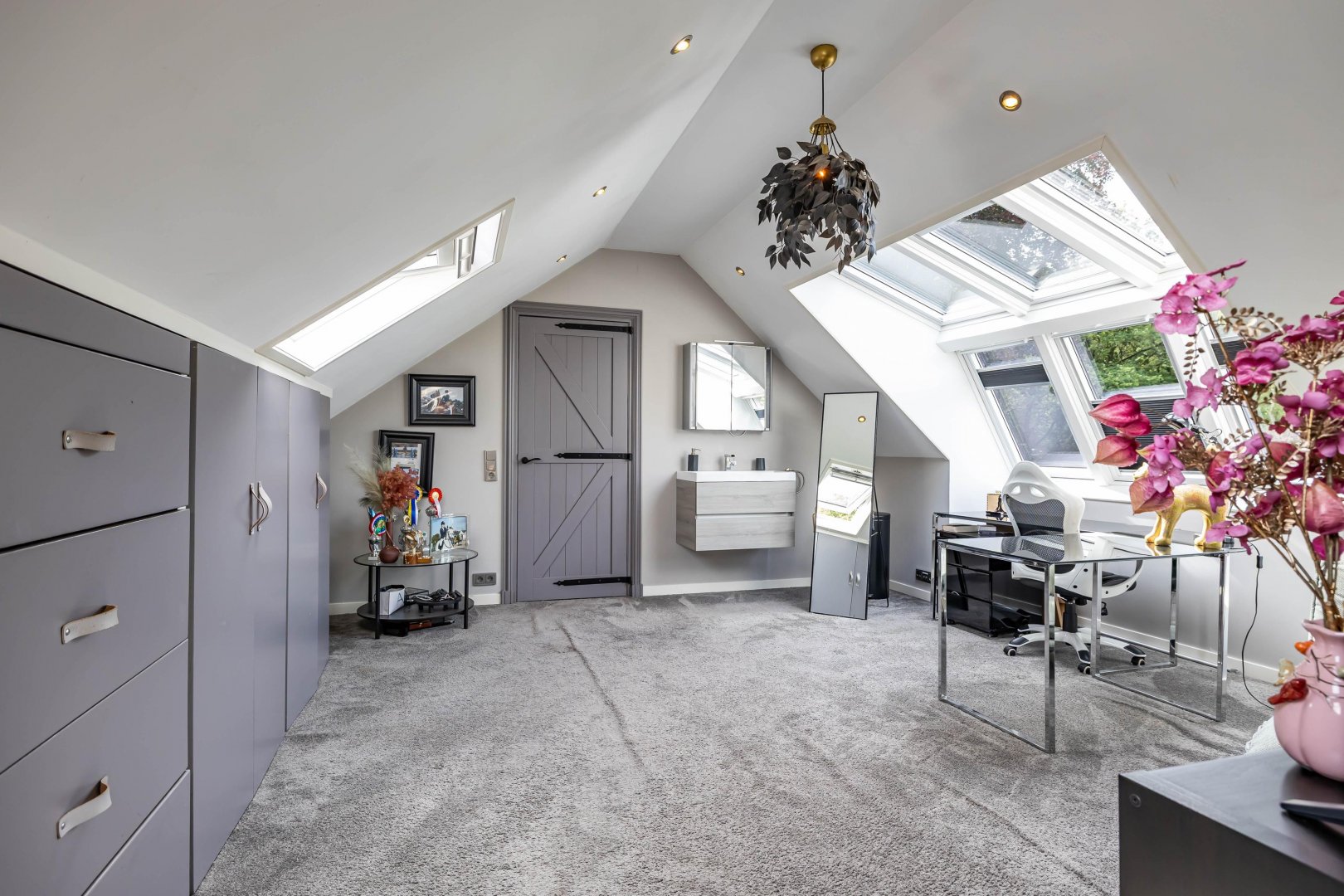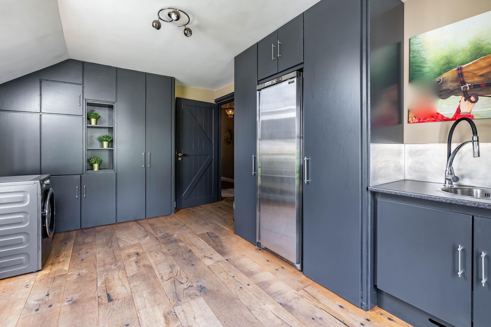 Via de centrale hal bereikt u een werkkamer (ook geschikt als extra slaapkamer), en een uiterst royale bijkeuken met toegang tot de tuin. In de bijkeuken is een CV ketel geplaatst en er is ruimte voor de wasmachine en droger. Beneden treft u eveneens een stijlvolle master bedroom aan met aangrenzende luxe eigen badkamer. De badkamer is voorzien van een toilet, dubbel wastafelmeubel, inloopdouche met
