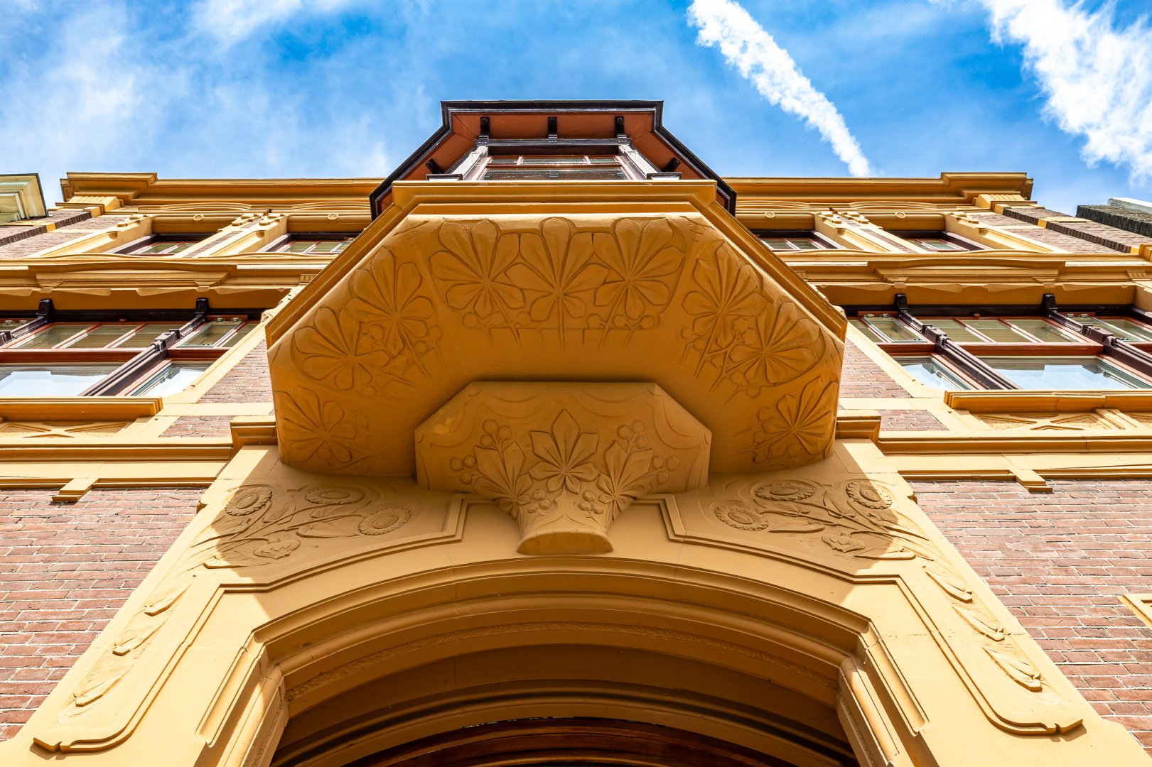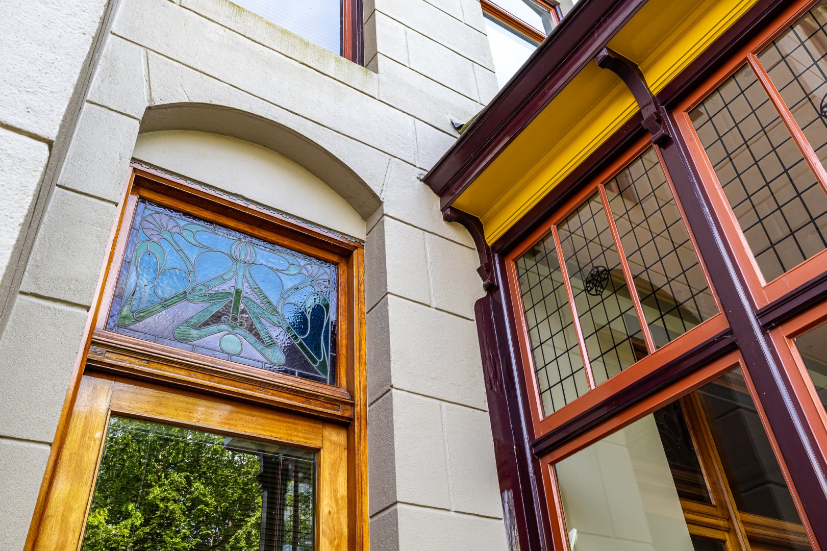 Bij aankomst aan de Ubbo Emmiussingel valt het oog ook direct op dit Herenhuis. De markante oude kleurstelling en de bijzondere symmetrie in de voorgevel vallen direct op waarbij de erker op de eerste verdieping met “wuif – balkon” op de tweede verdieping een fraaie onderbreking vormt in de statige gevel.