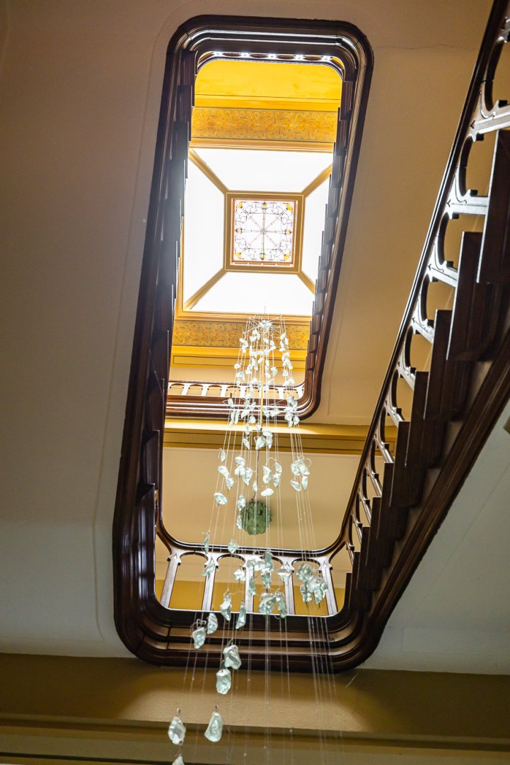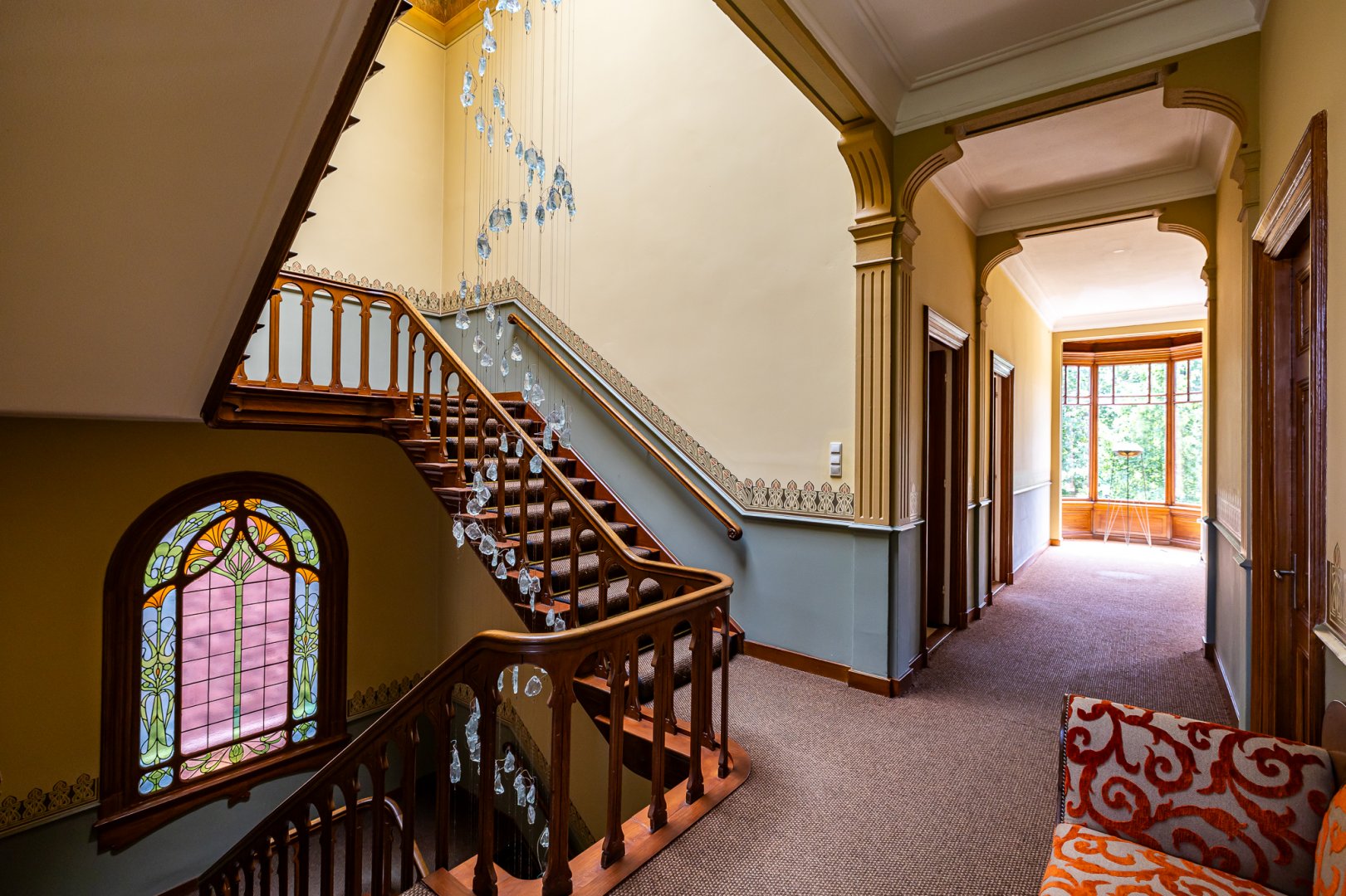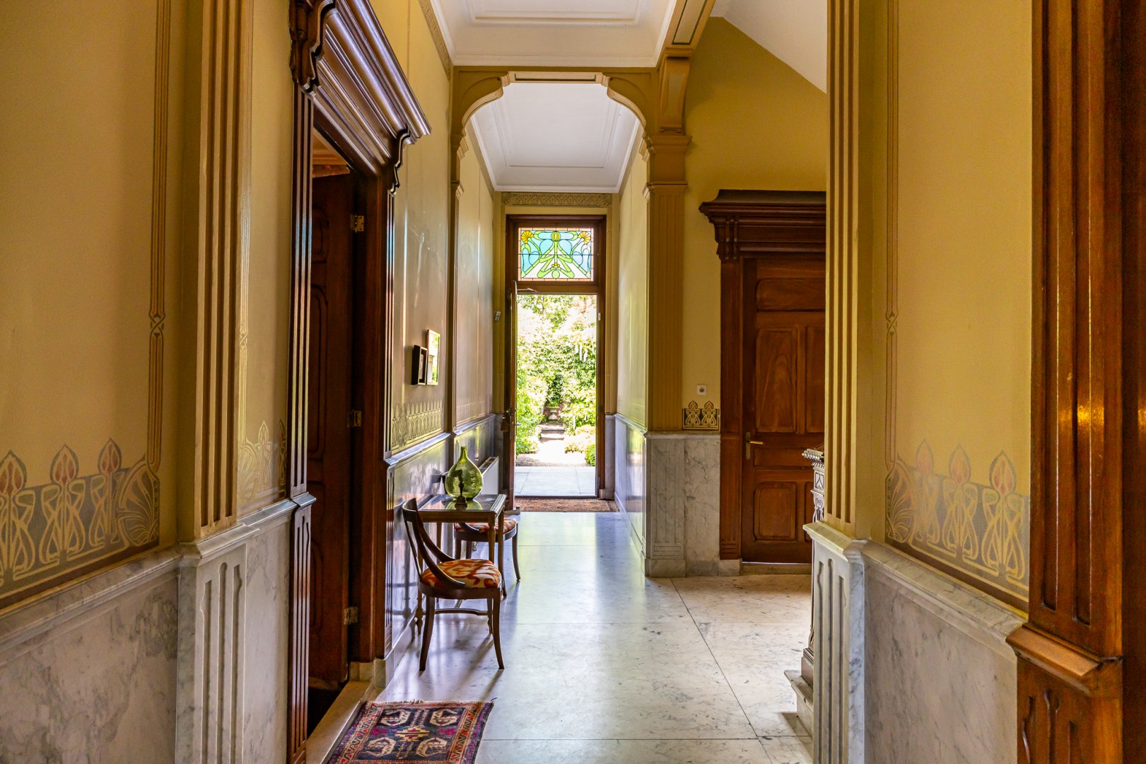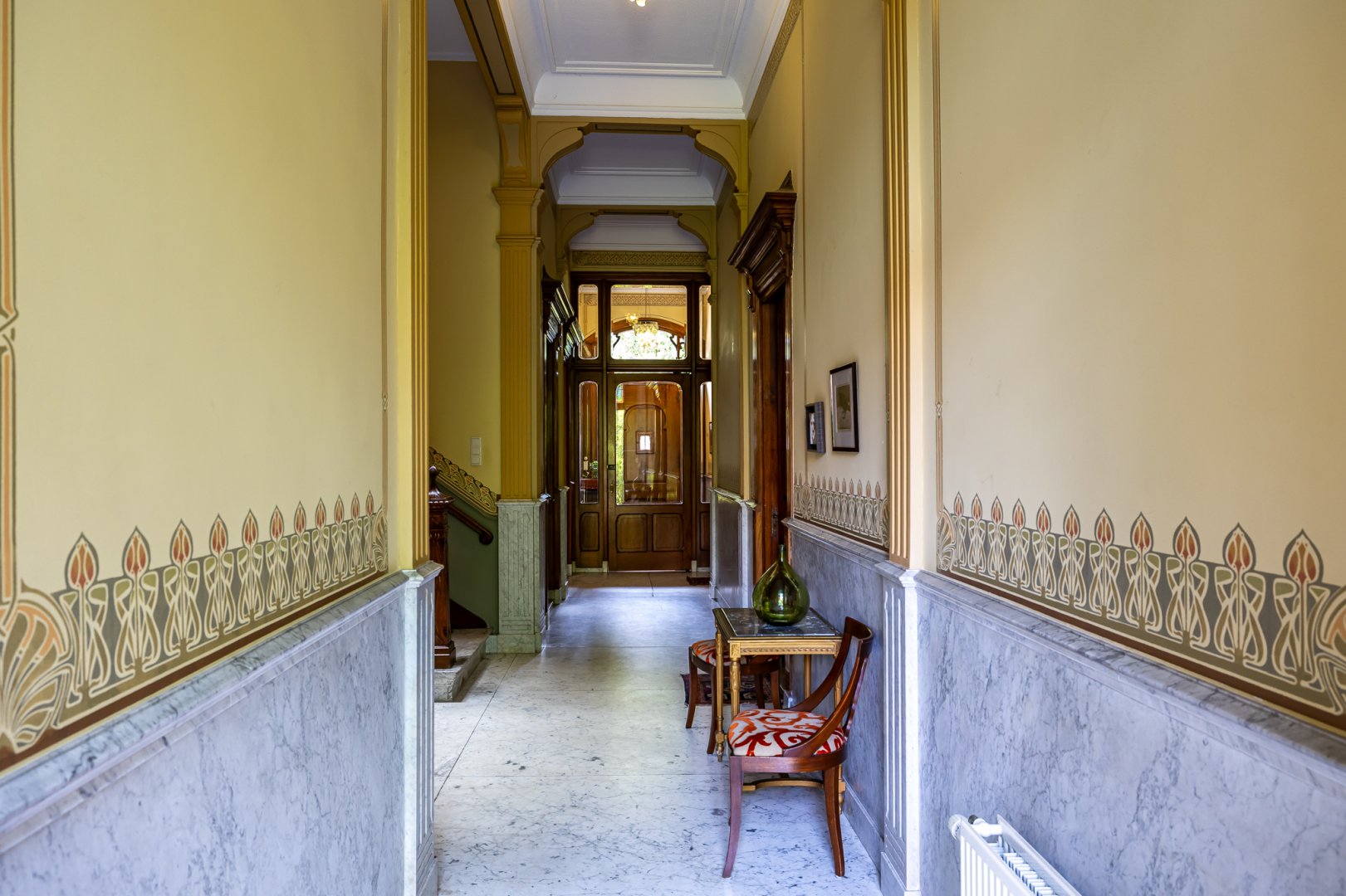 De statige voordeur geeft toegang tot de vestibule met aansluitend de imposante hal. Het trappenhuis in de hal is zeer rijk vormgegeven en is een ware “eyecatcher” in het hart van het huis. Dit wordt versterkt door de kunstzinnige DNA lamp naar een ontwerp van Albert Geertjes en de uiterst bijzondere glas in lood ramen.
