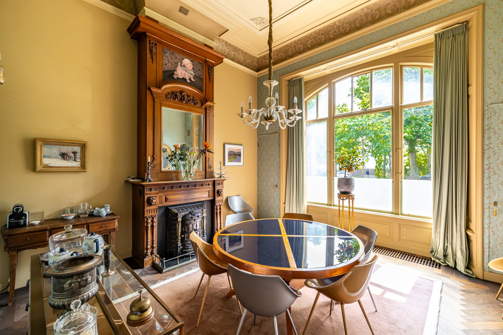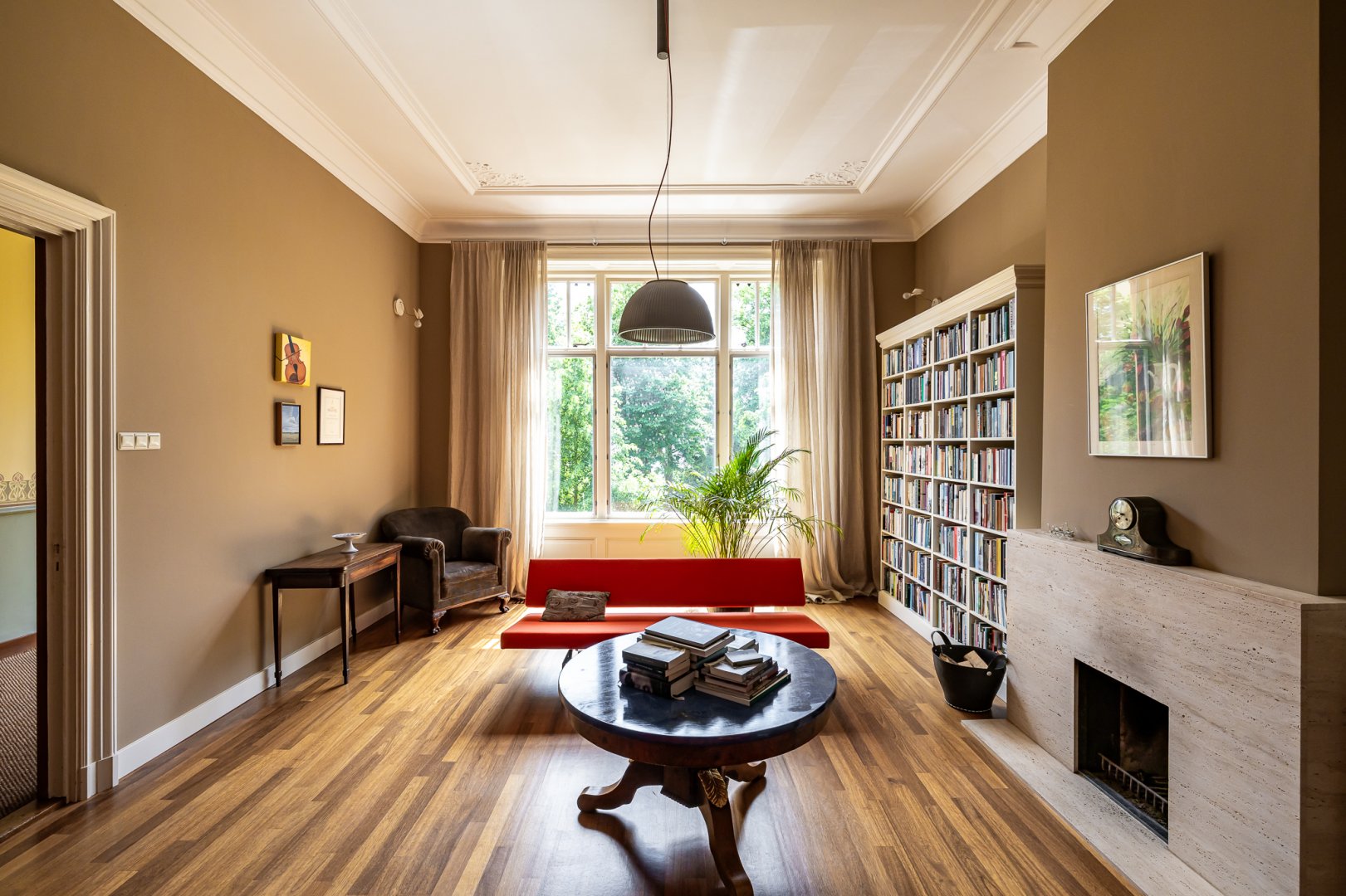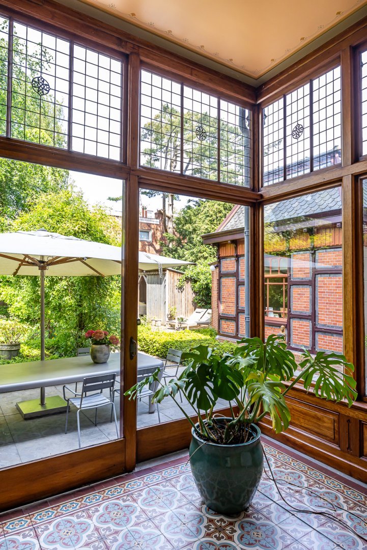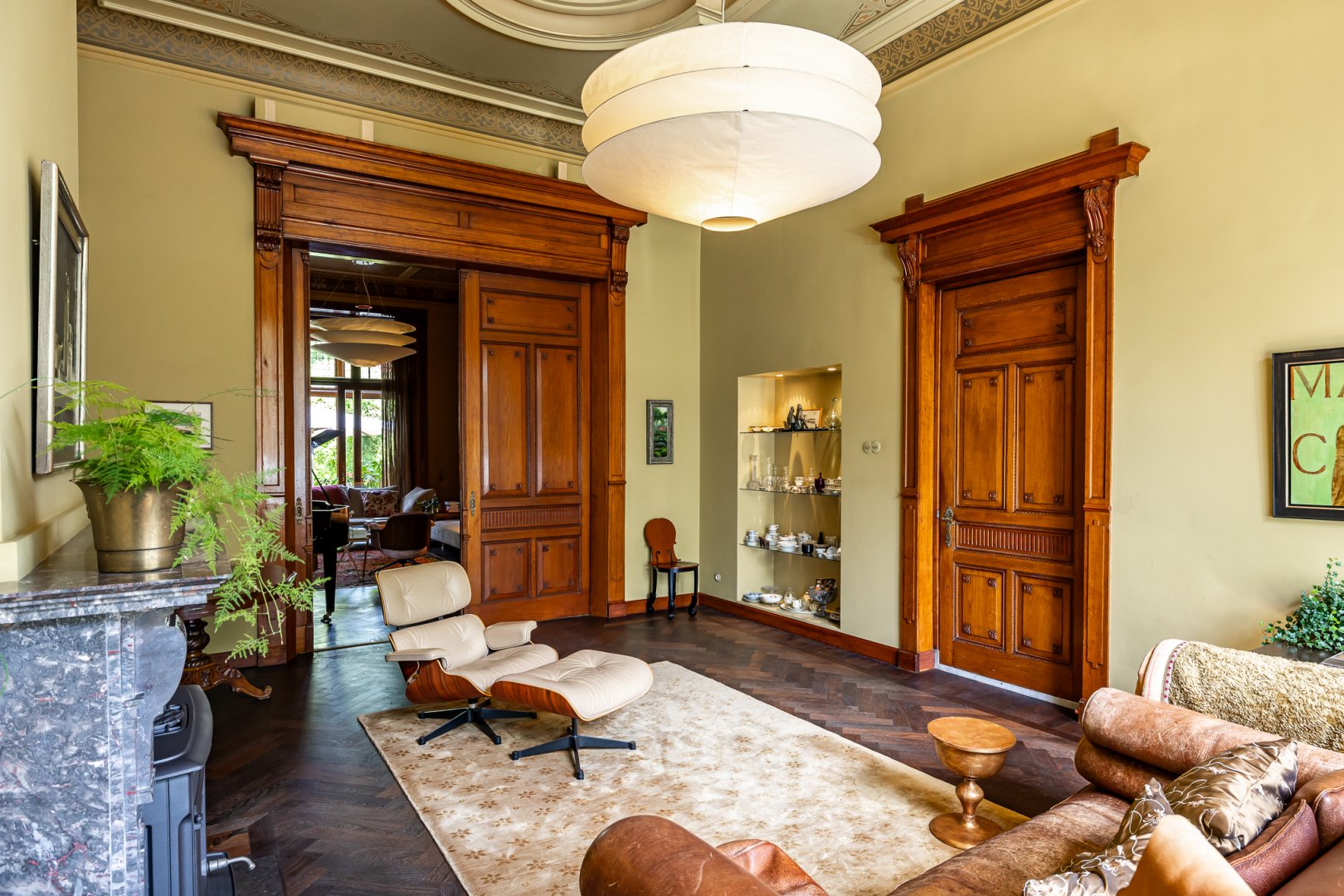 De living heeft de grandeur die past bij het huis, hoge en perfect bewerkte plafonds met bijzondere kleurencombinaties en een fraaie vlakverdeling. De living is een kamer en suite met aan de achterzijde een serre. Zowel de voor- als achtersuite beschikken over marmeren schouwen en de serre is de perfecte plek om van de voor stadse begrippen forse tuin te genieten.