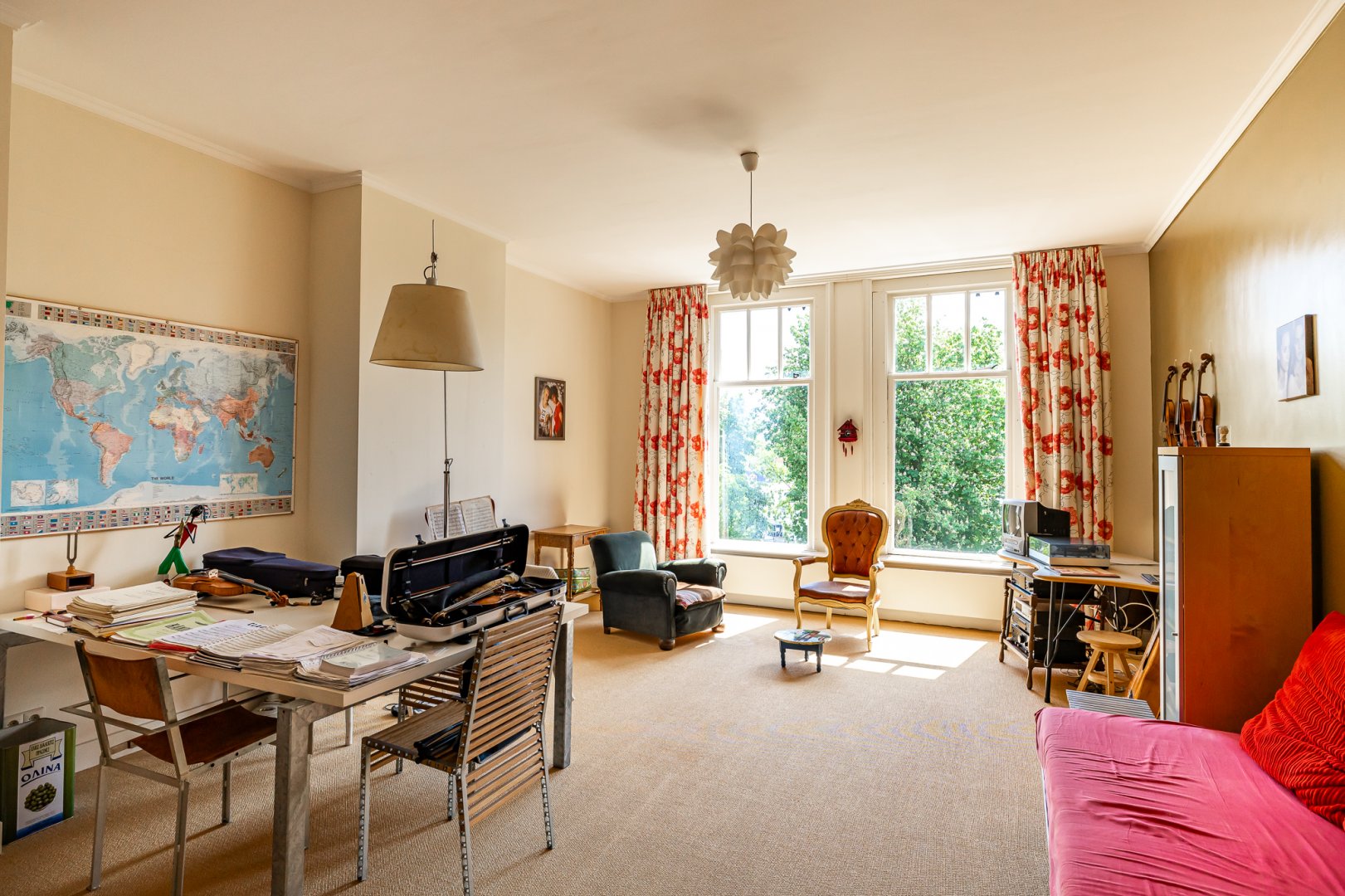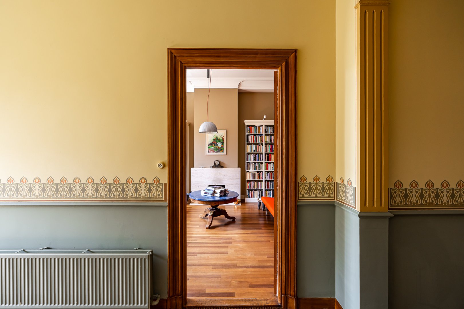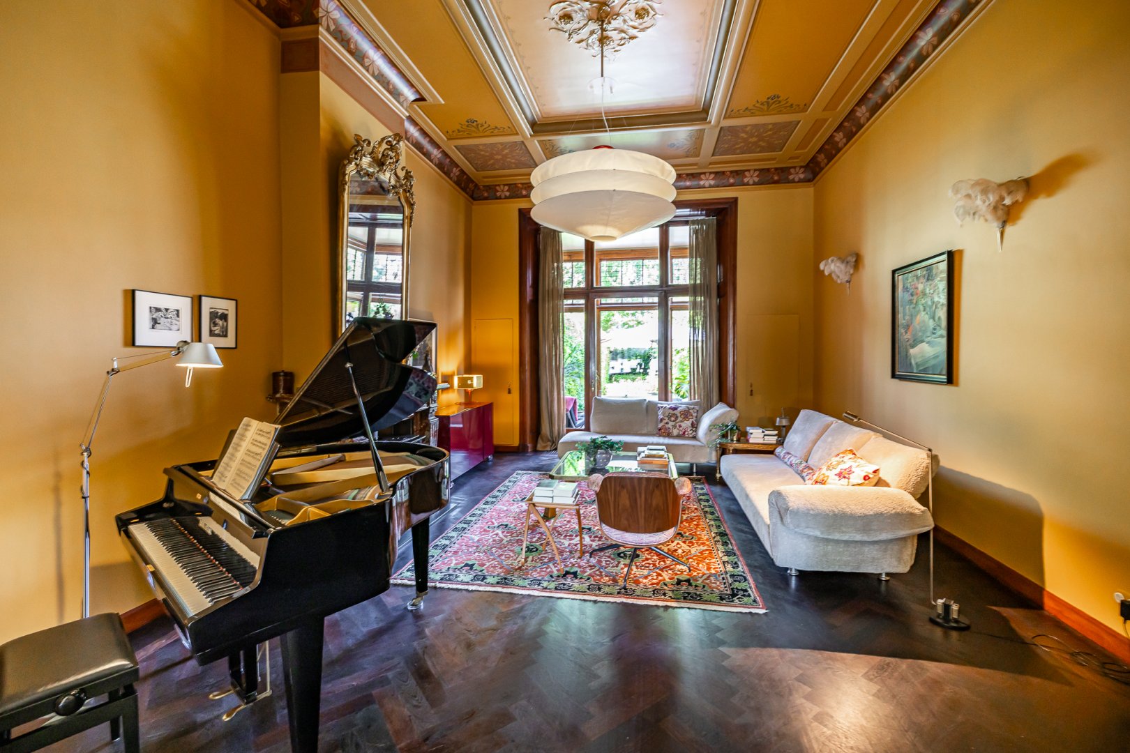 De living heeft de grandeur die past bij het huis, hoge en perfect bewerkte plafonds met bijzondere kleurencombinaties en een fraaie vlakverdeling. De living is een kamer en suite met aan de achterzijde een serre. Zowel de voor- als achtersuite beschikken over marmeren schouwen en de serre is de perfecte plek om van de voor stadse begrippen forse tuin te genieten.