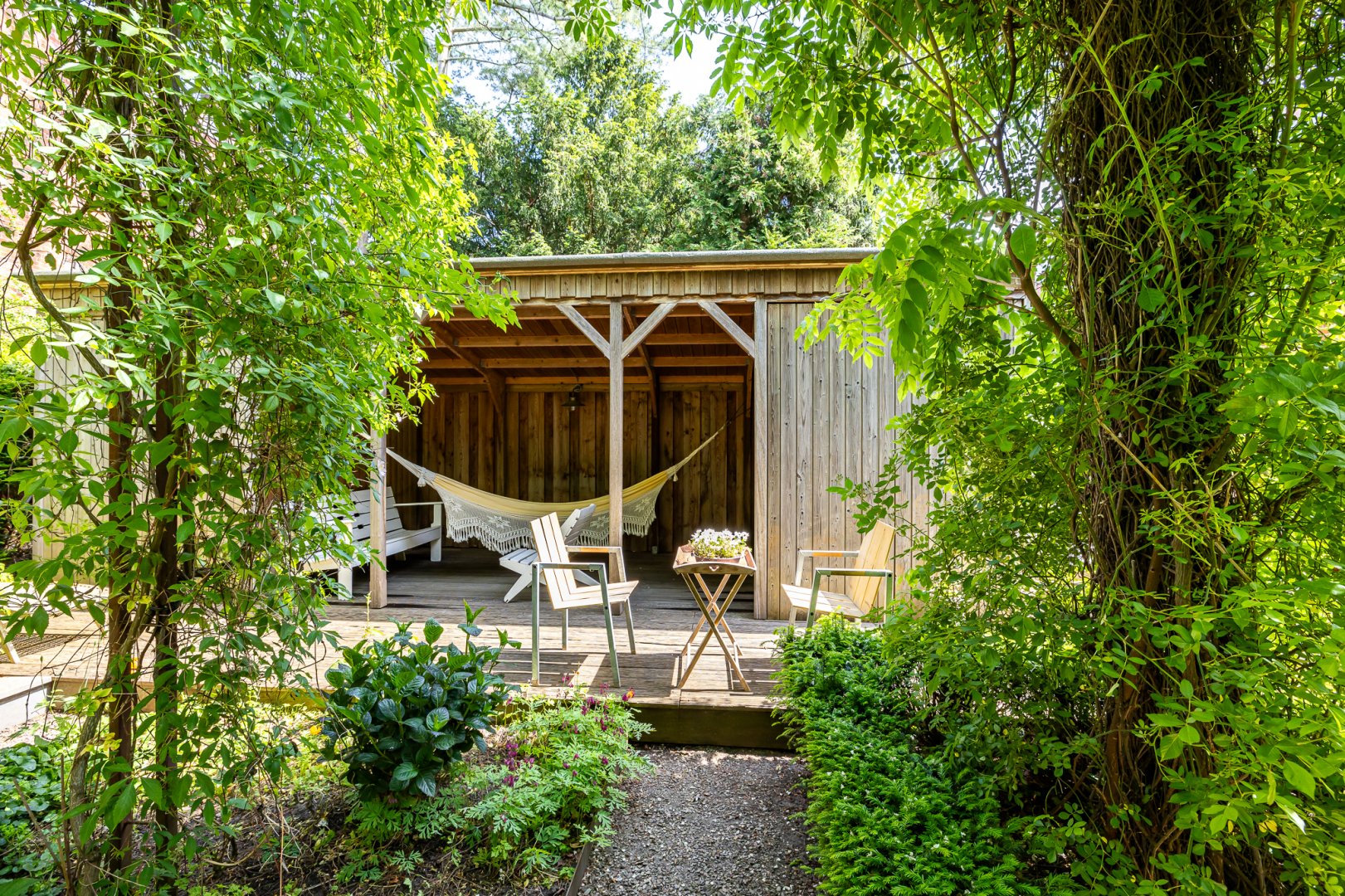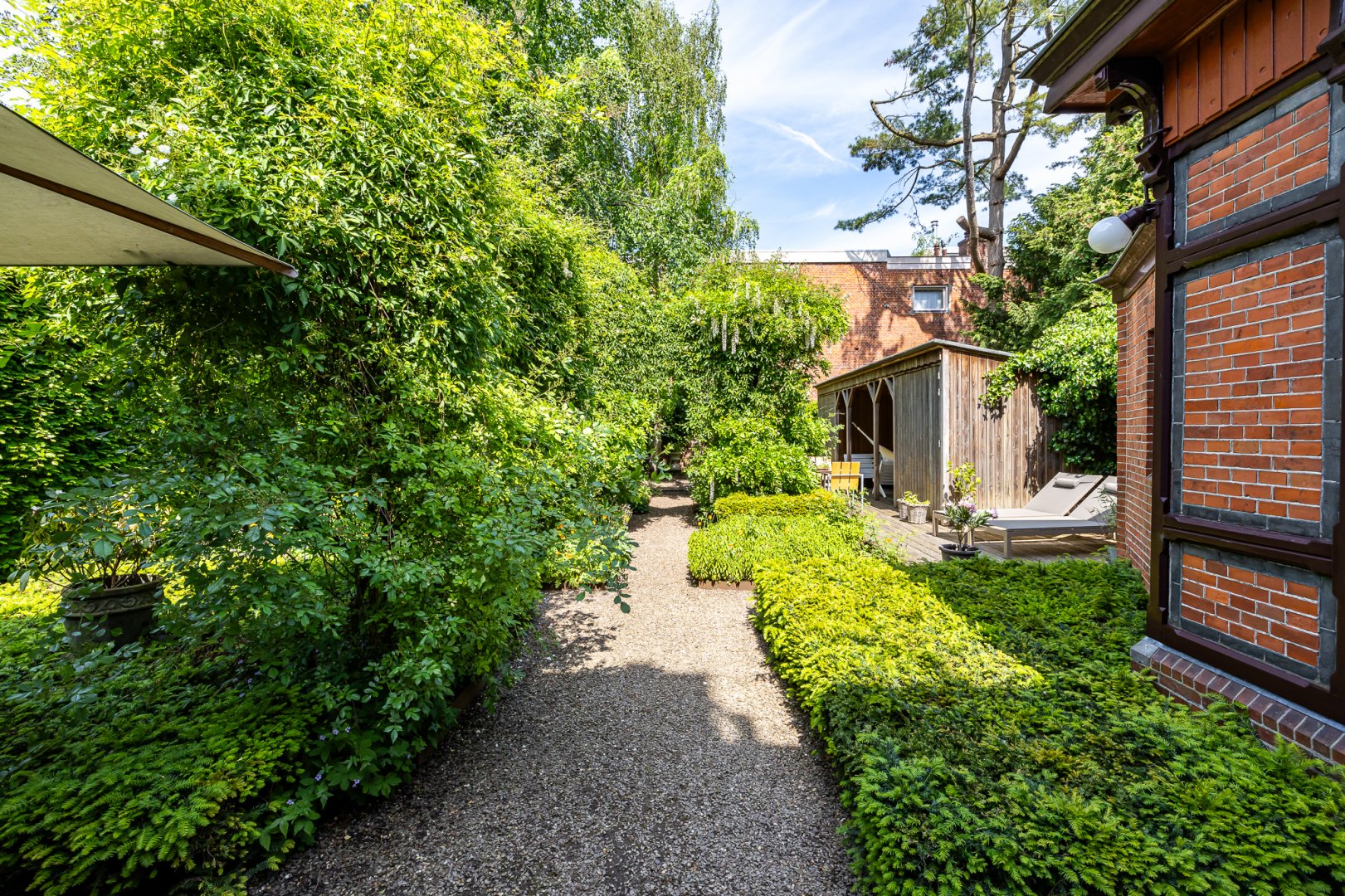 De tuin is onder architectuur aangelegd en combineert volwassen groen met leuke terrassen en borders, daarnaast is er een overkapping – veranda die is gericht op de avondzon. Een heerlijke plek om in de warme zomeravonden van de ondergaande zon te genieten. Ook is er nog een praktische berging voor de fietsen en het nodige tuingereedschap.
