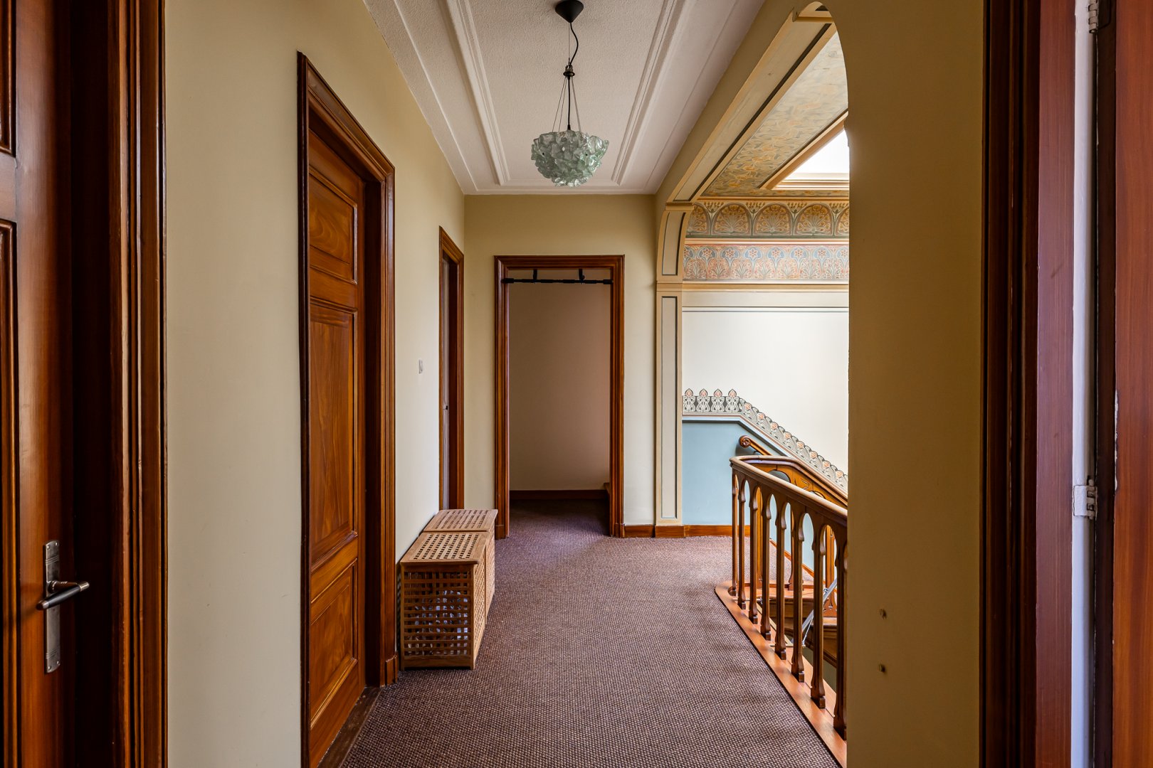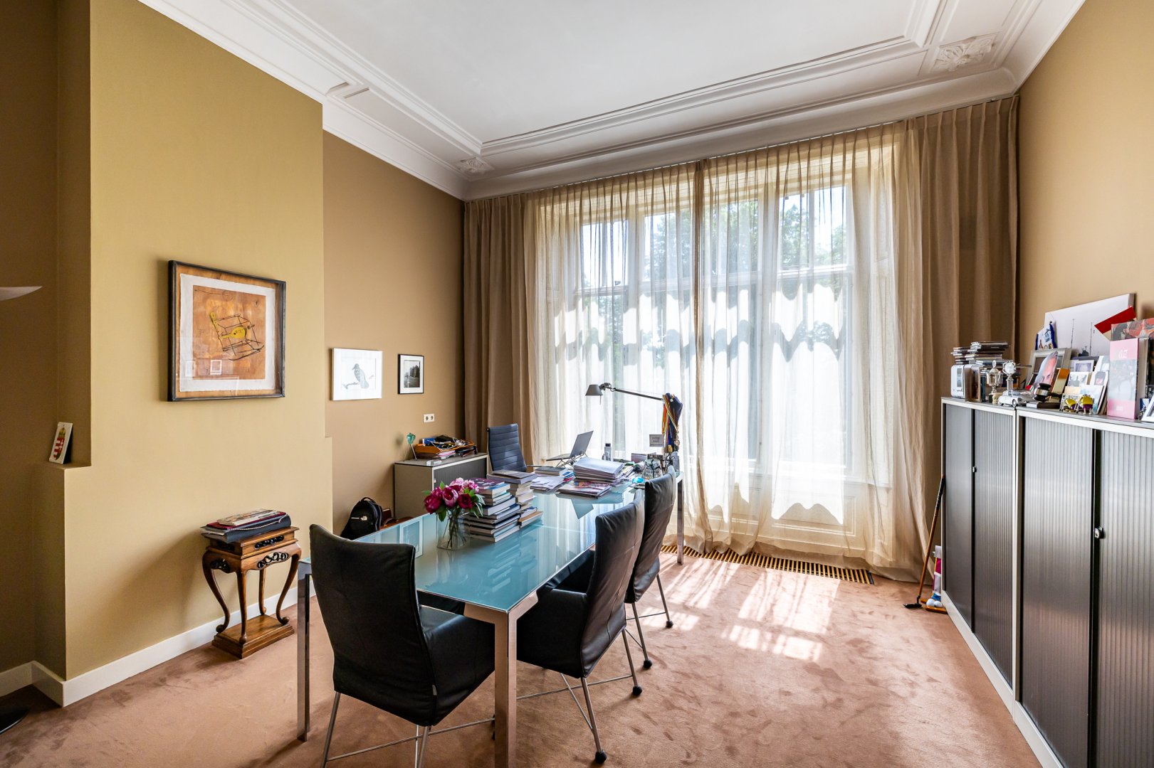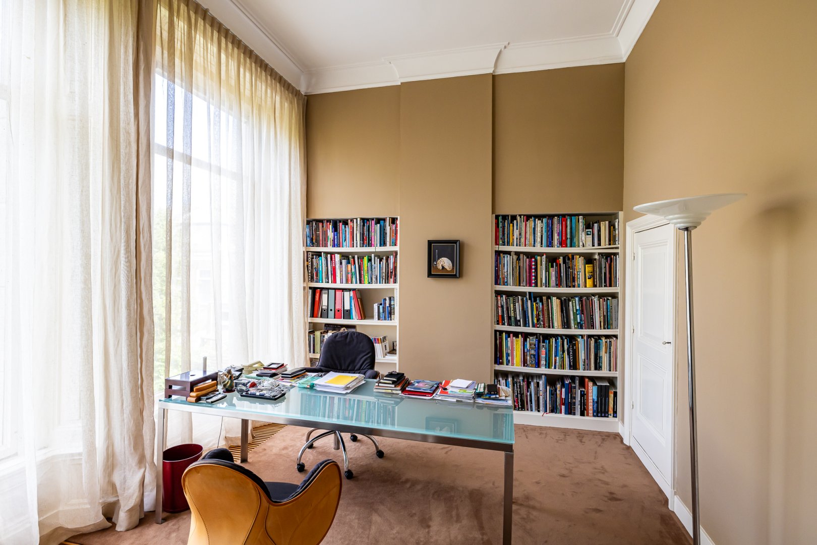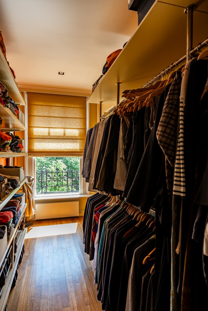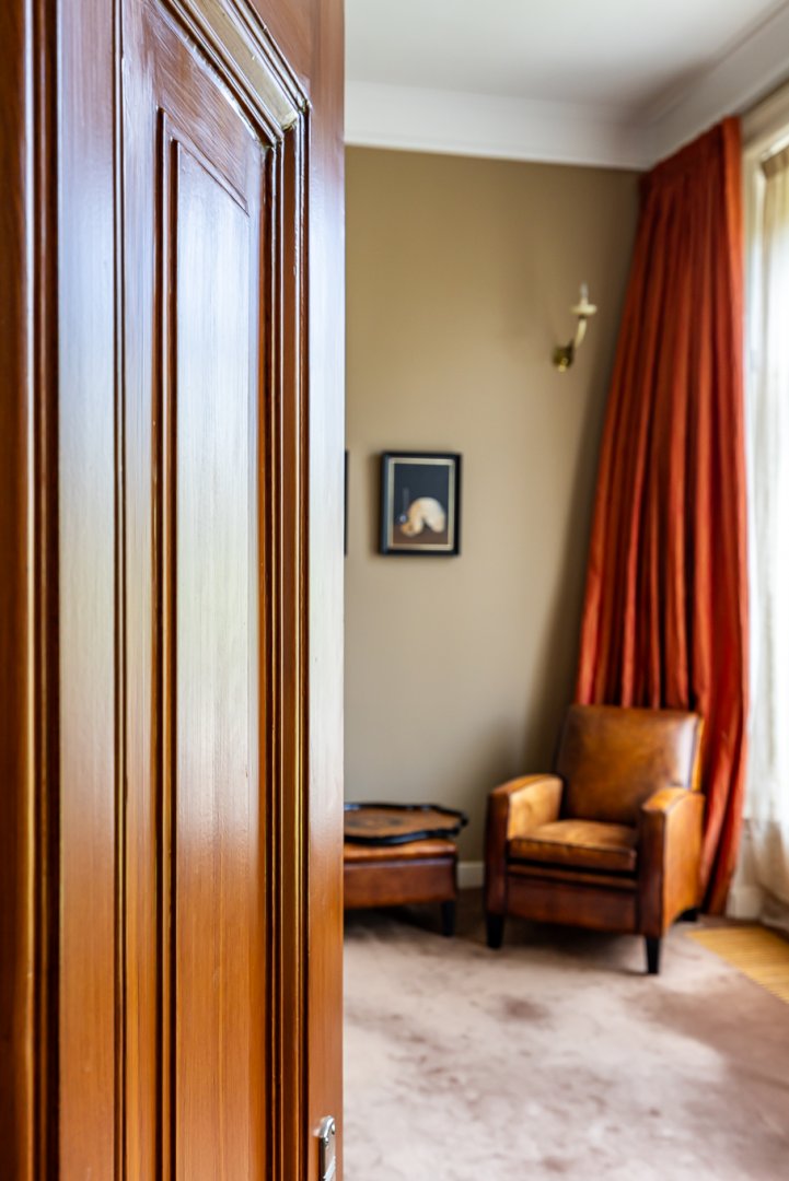 Aan de rechterzijde van het huis is direct vanuit de hal een fraaie werk – studeerkamer die eveneens is voorzien van een haard en hoge bewerkte plafonds. Boven de kelder is nog een ruime garderobe – inloopkamer die eveneens vanuit de hal is te bereiken.