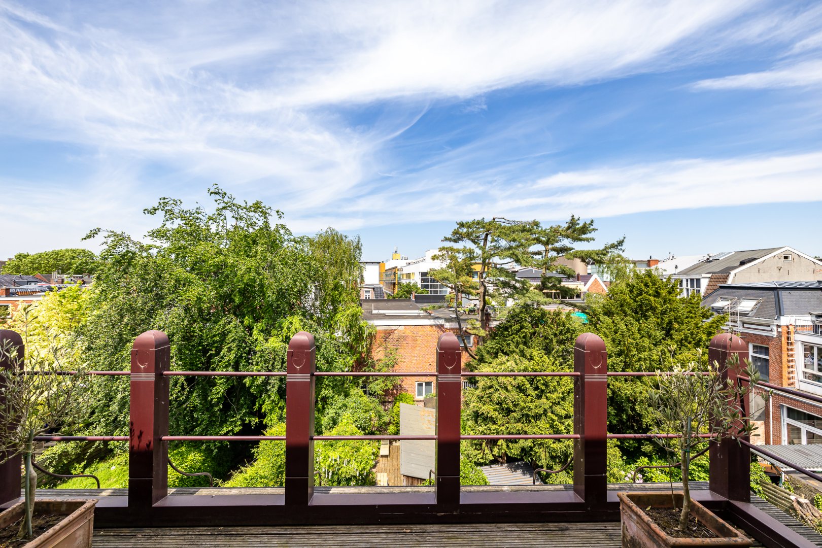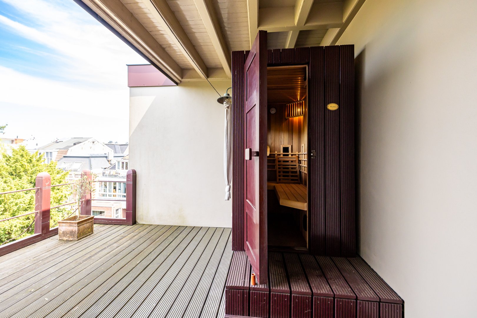 Op de achterzijde is een deels overdekt dakterras aanwezig met hierop een knusse sauna/infrarood cabine! Een plek om in alle luwte van de stad volledig tot rust te komen.