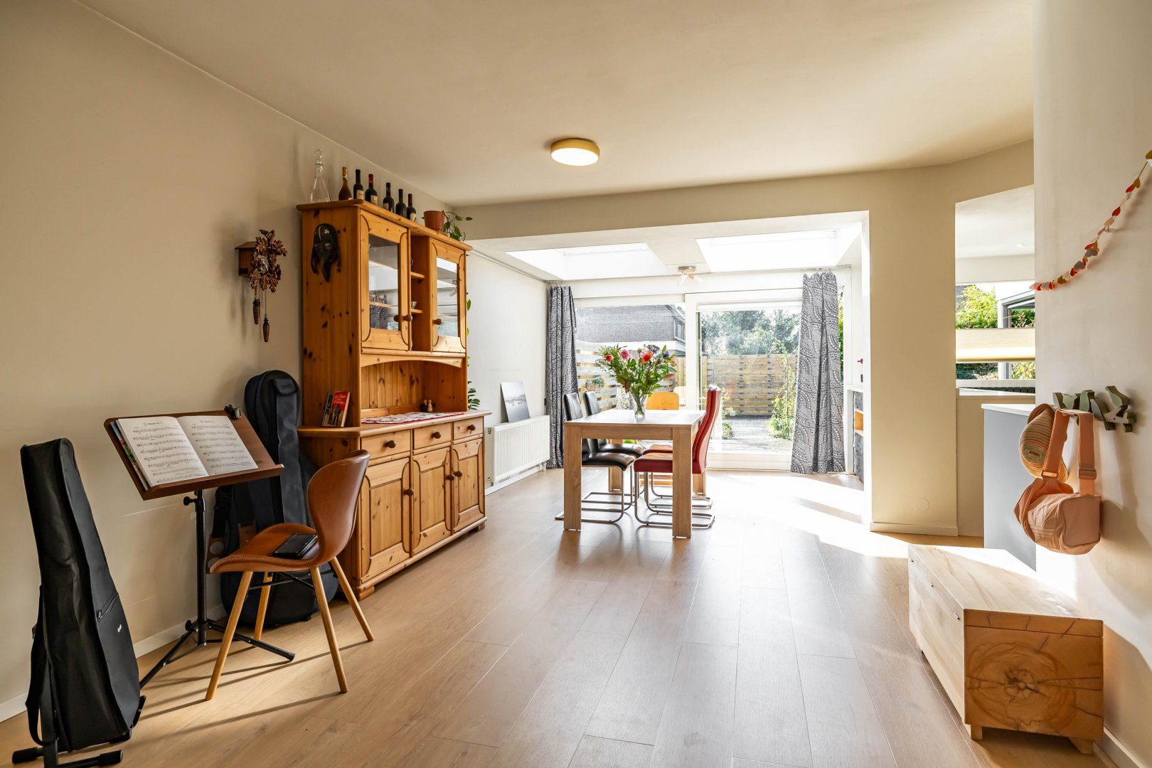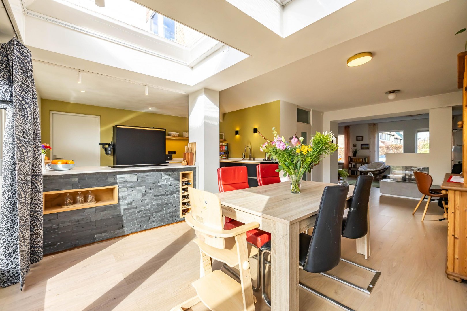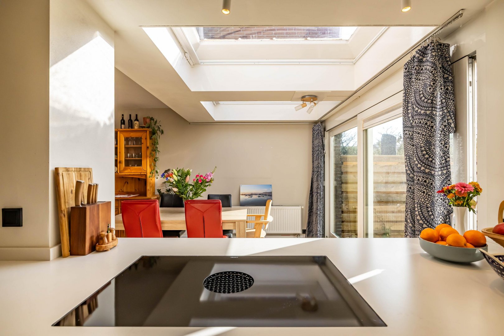 Hal, toilet en trapopgang. Royale living met gashaard aan de voorzijde van de woning. Aan de achterzijde vinden we de moderne, open keuken met kookeiland. De keuken is heerlijk licht door de dakkoepels en de uitbouw aan de achterzijde. Via de schuifpui stap je zo de zonnige tuin in. Direct grenzend aan de keuken bevindt zich de praktische bijkeuken. De fietsenschuur (voormalige garage) biedt met 11 m2 voldoende ruimte.