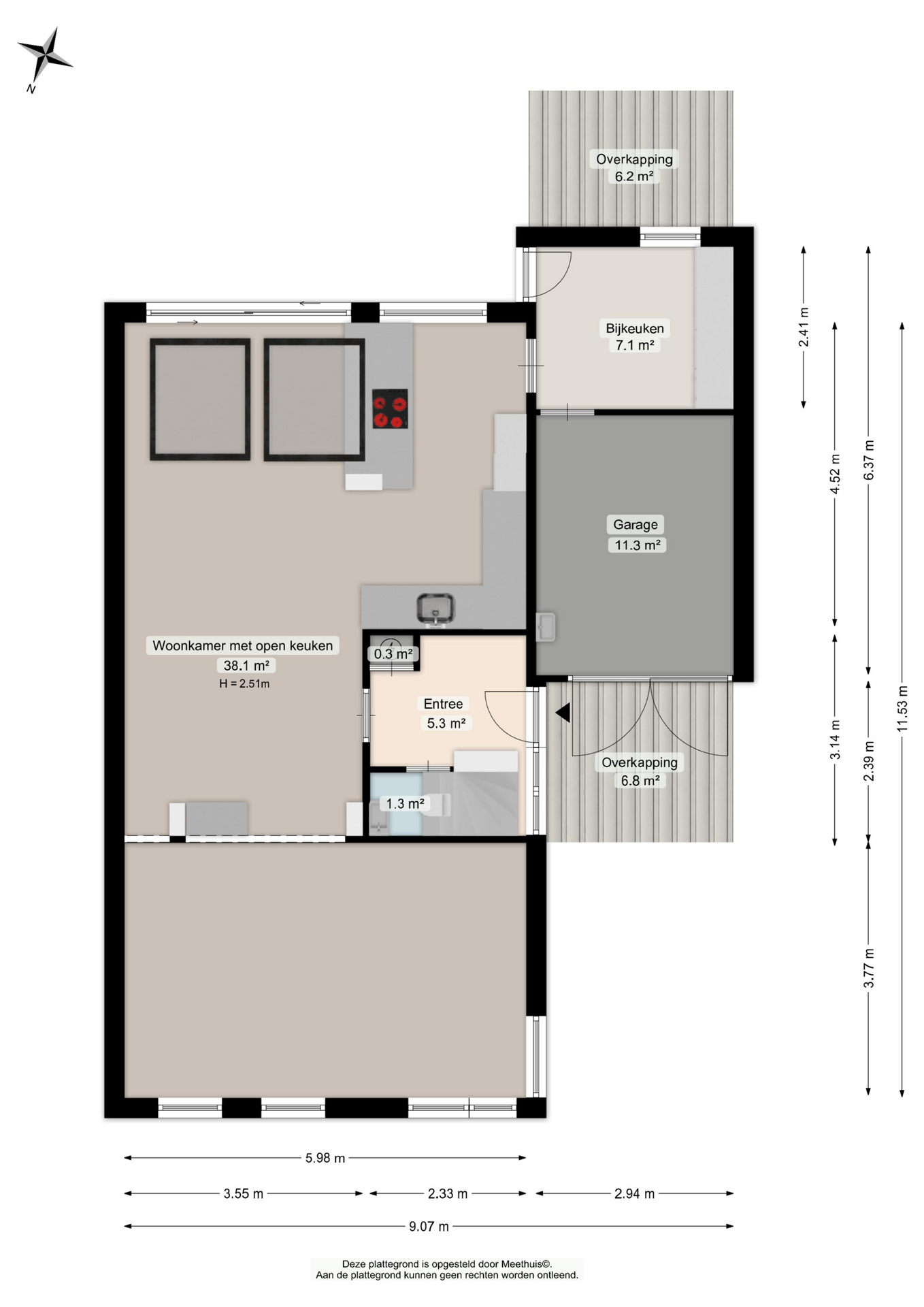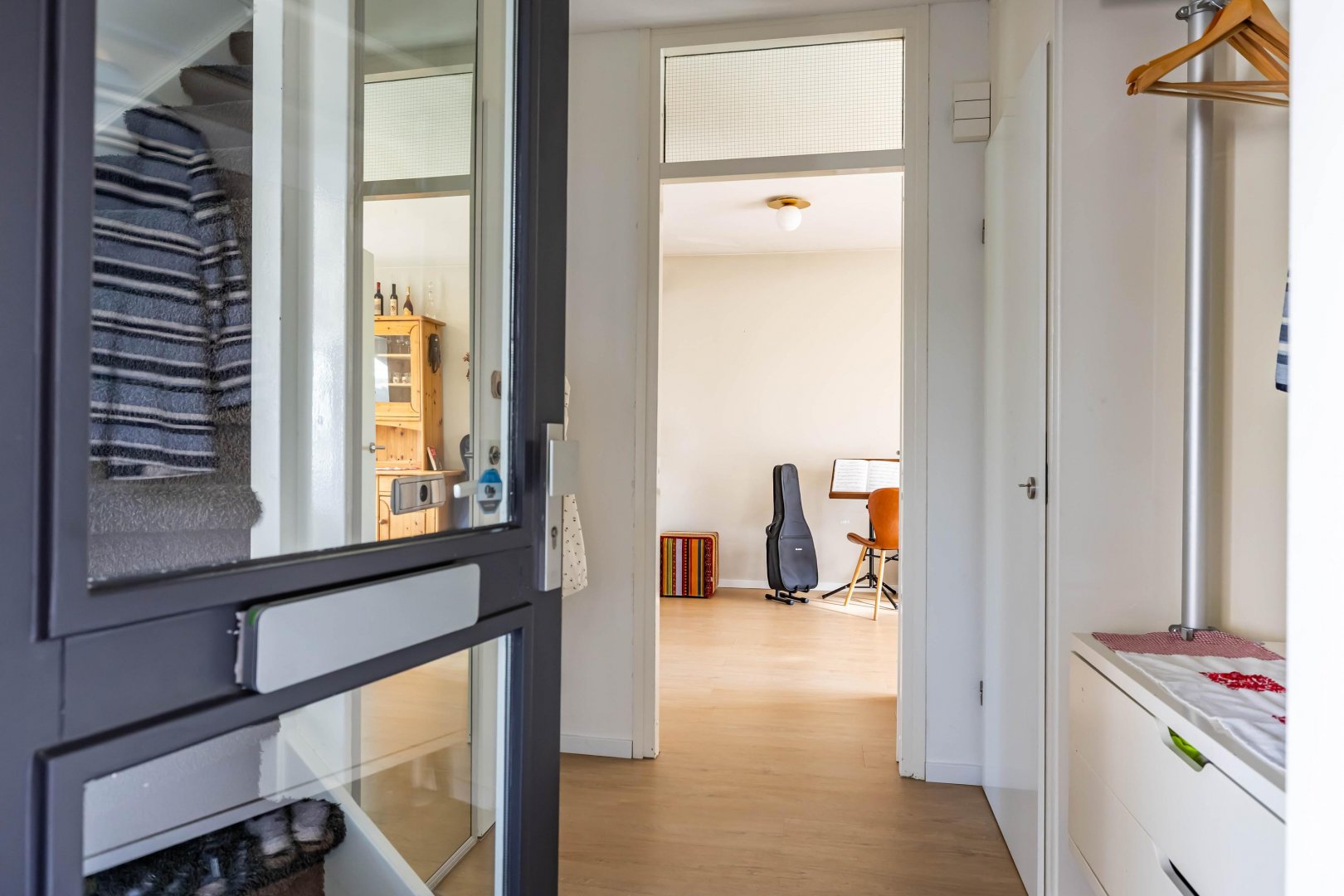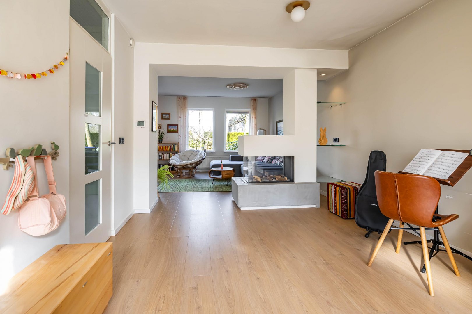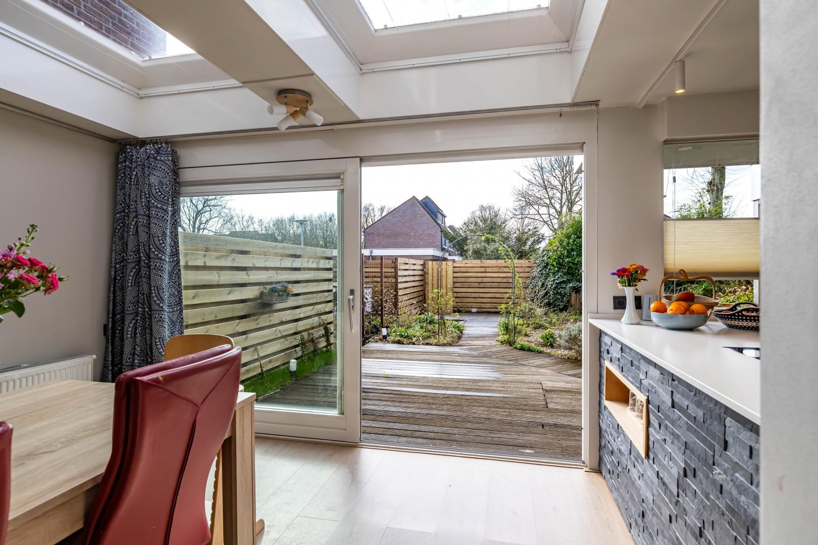 Hal, toilet en trapopgang. Royale living met gashaard aan de voorzijde van de woning. Aan de achterzijde vinden we de moderne, open keuken met kookeiland. De keuken is heerlijk licht door de dakkoepels en de uitbouw aan de achterzijde. Via de schuifpui stap je zo de zonnige tuin in. Direct grenzend aan de keuken bevindt zich de praktische bijkeuken. De fietsenschuur (voormalige garage) biedt met 11 m2 voldoende ruimte.