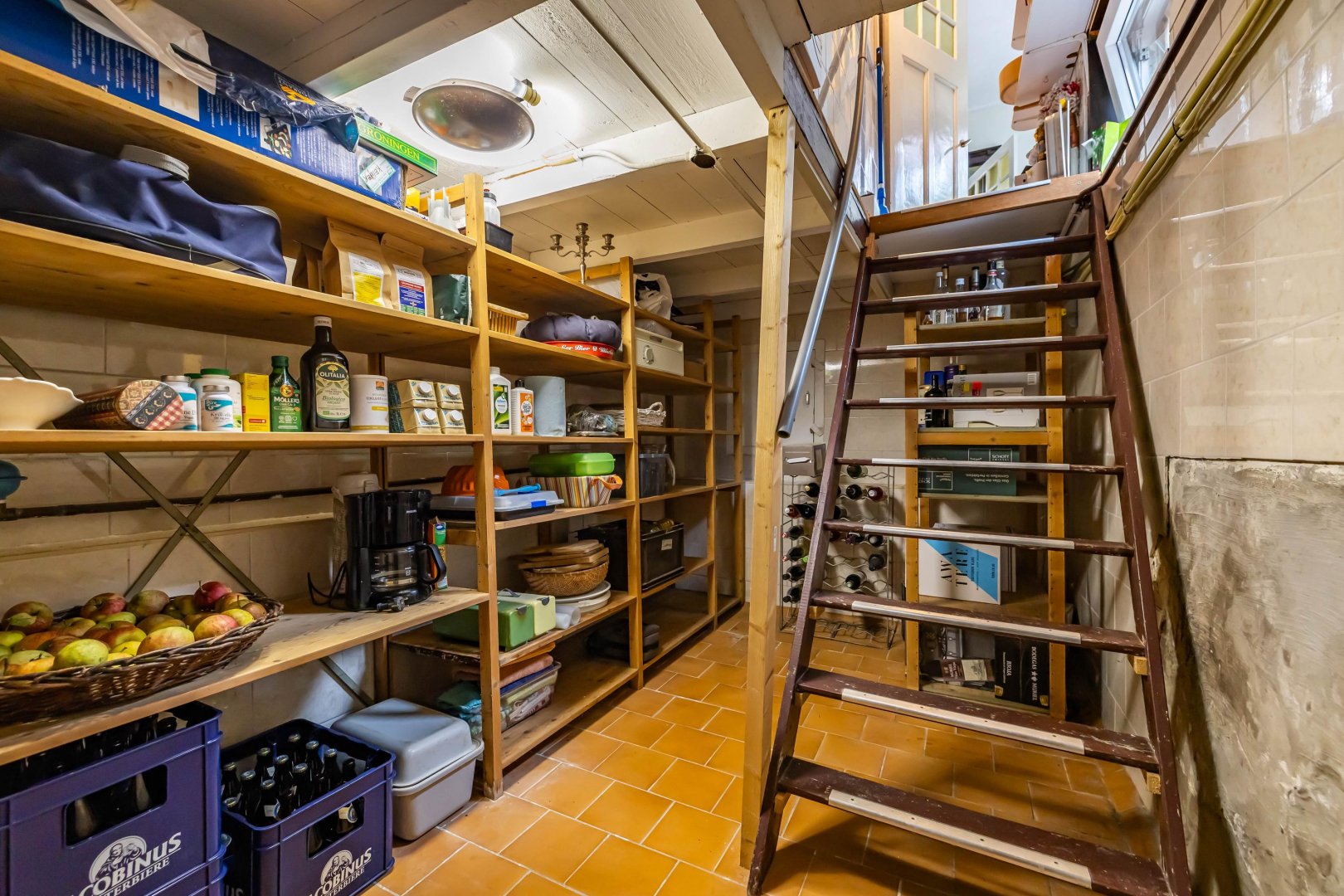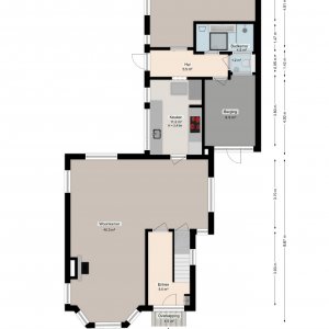 Indeling: entree, hal, met trap naar de verdieping, sfeervolle woonkamer in L-vorm (circa 45m²) met gashaard, erker aan de voorzijde en schuifpui naar de tuin. Via de woonkamer de deur naar de provisiekelder van circa 9 m².