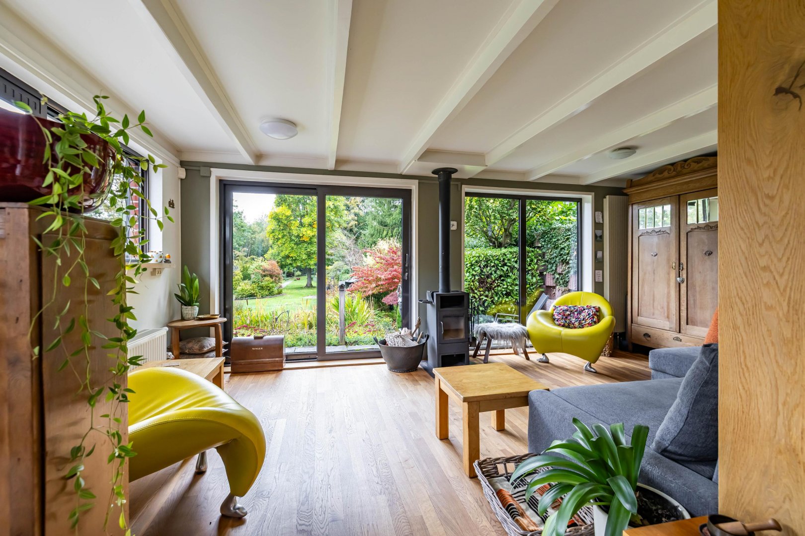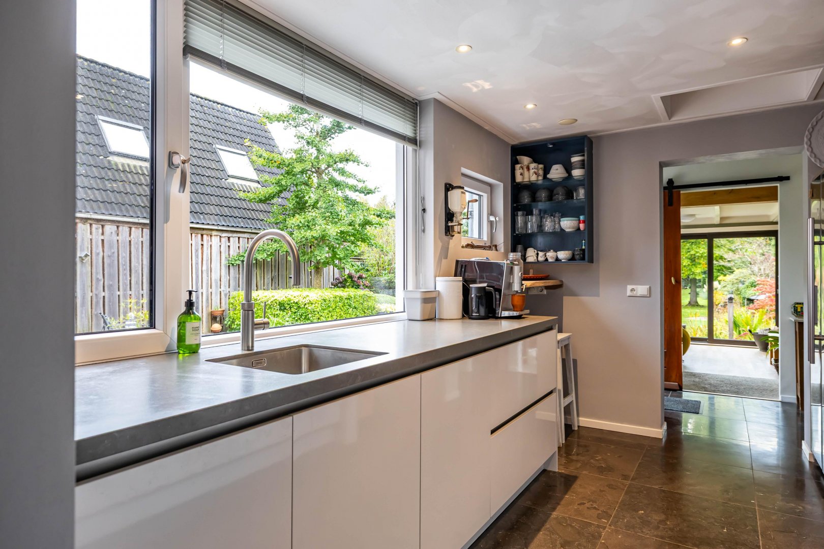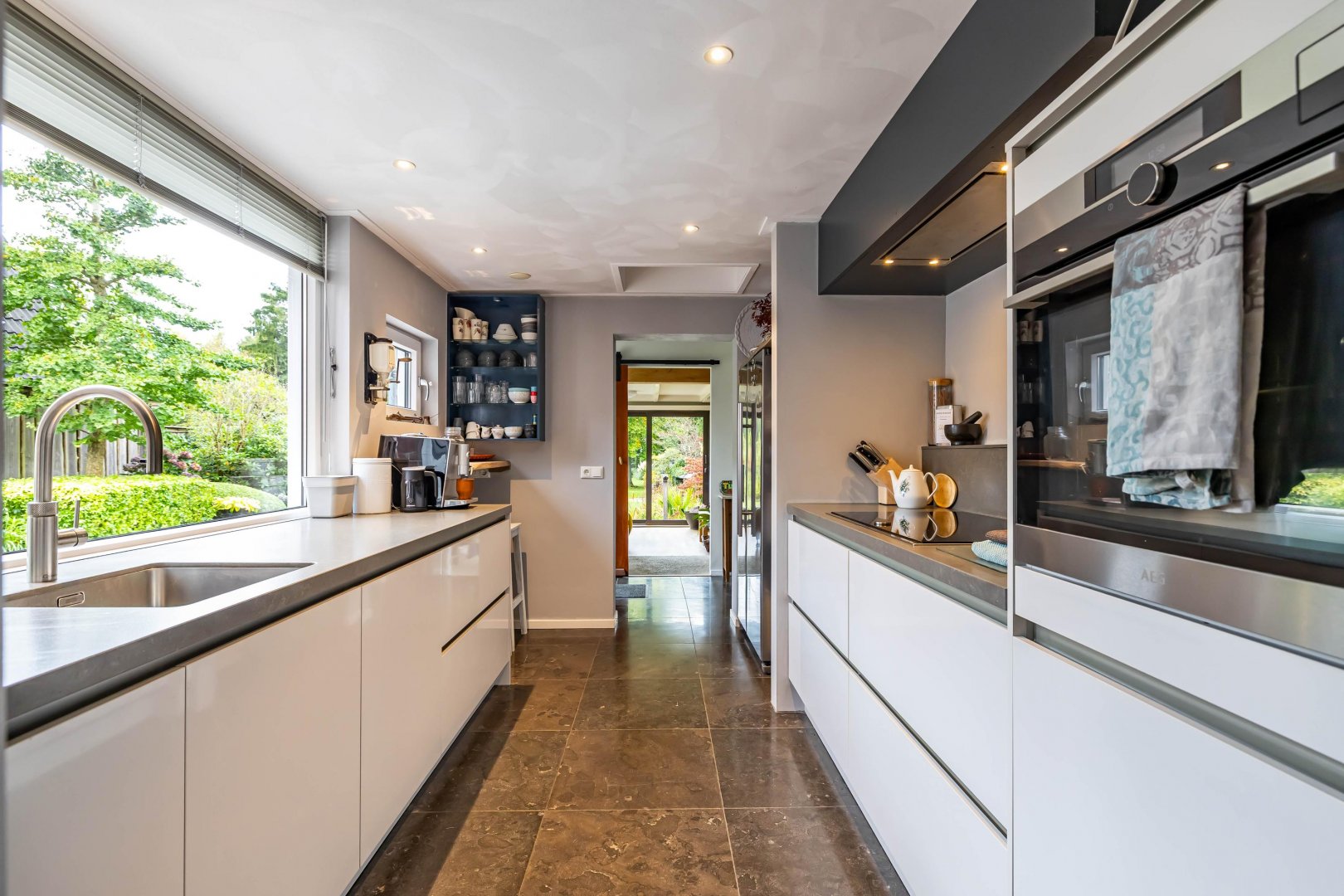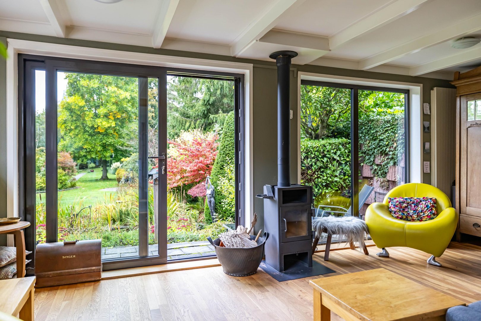 Vanuit de woonkamer kunt u naar de keuken in de aanbouw. De moderne keuken is vernieuwd in 2019, beschikt over een dubbel werkblad en diverse inbouw apparatuur (o.a. quooker, inductiekookplaat, vaatwasser) en een groot raam met zicht op het naast gelegen terras. Achter de keuken het toilet, een tweede moderne badkamer (2019) met douche, aanrechtblad met wastafel en plaats voor de wasmachine. Doorloop naar de tuinkamer en een (binnendoor) deur naar de schuur/garage. De achtergelegen tuinkamer is misschien wel de mooiste kamer van het huis en nu in gebruik als tweede woonkamer. Deze kamer van 21m² heeft prachtig uitzicht over de fraaie diepe achtertuin door middel van twee grote glaspuien. Een daarvan voorzien van een schuifpui.