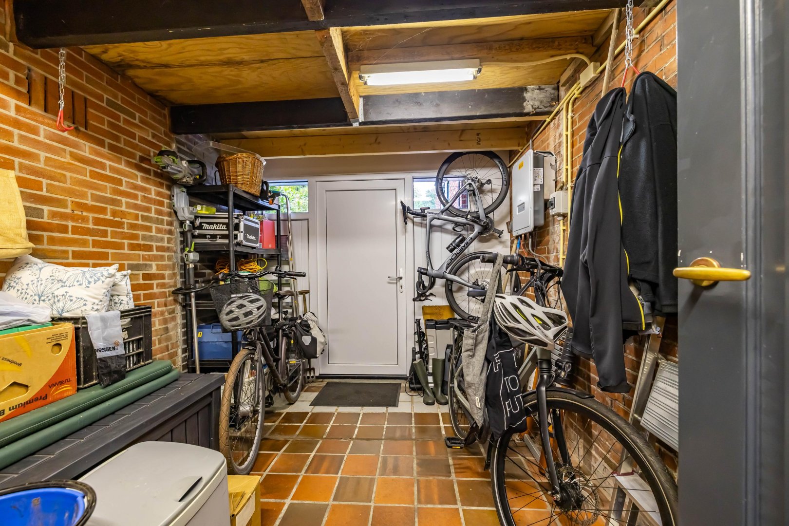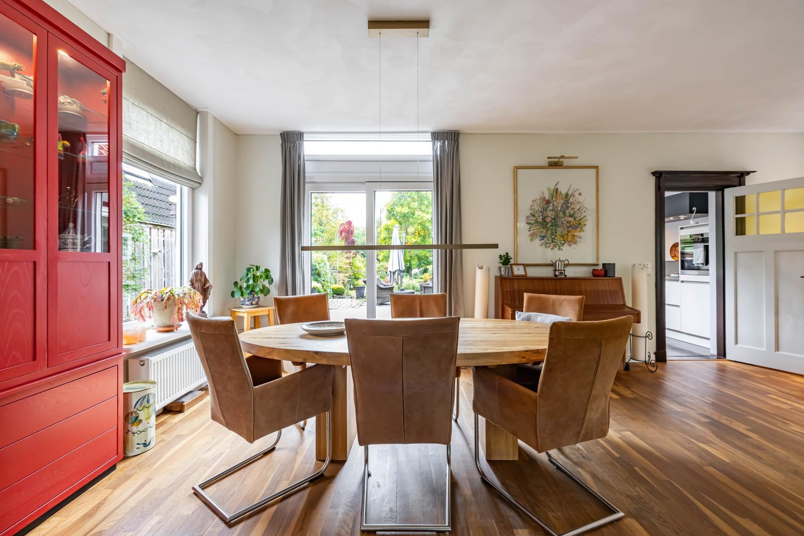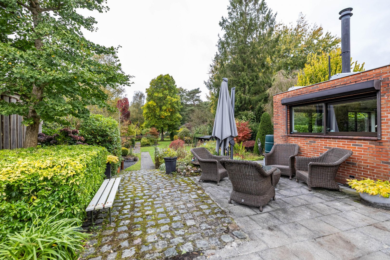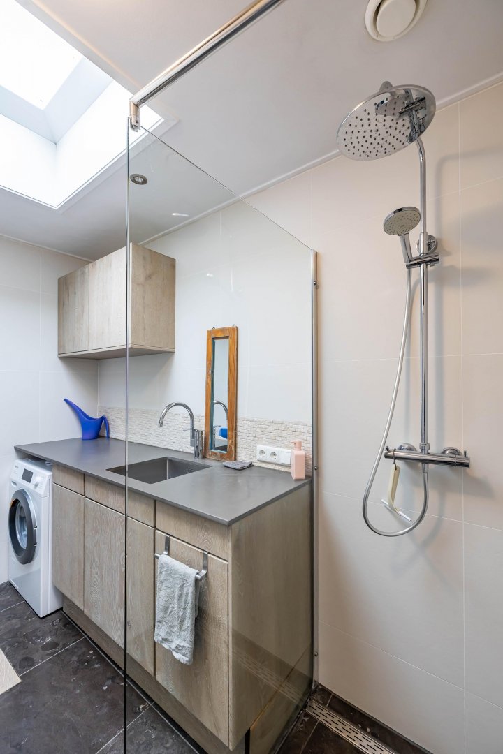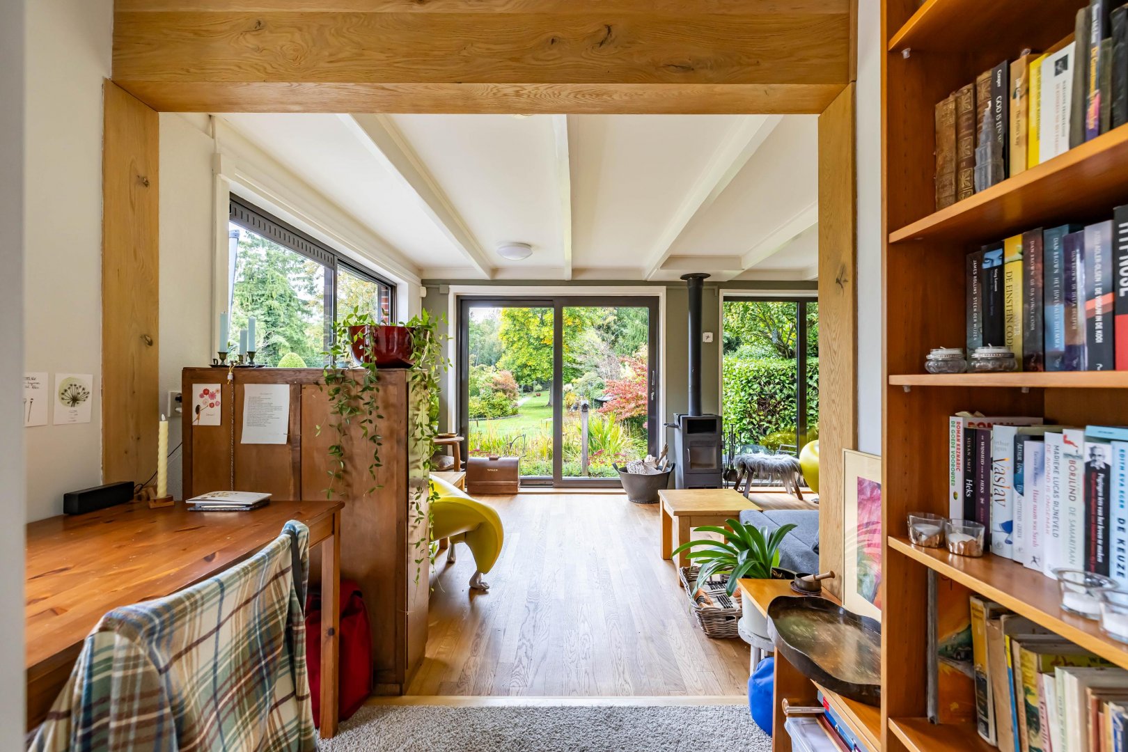 Vanuit de woonkamer kunt u naar de keuken in de aanbouw. De moderne keuken is vernieuwd in 2019, beschikt over een dubbel werkblad en diverse inbouw apparatuur (o.a. quooker, inductiekookplaat, vaatwasser) en een groot raam met zicht op het naast gelegen terras. Achter de keuken het toilet, een tweede moderne badkamer (2019) met douche, aanrechtblad met wastafel en plaats voor de wasmachine. Doorloop naar de tuinkamer en een (binnendoor) deur naar de schuur/garage. De achtergelegen tuinkamer is misschien wel de mooiste kamer van het huis en nu in gebruik als tweede woonkamer. Deze kamer van 21m² heeft prachtig uitzicht over de fraaie diepe achtertuin door middel van twee grote glaspuien. Een daarvan voorzien van een schuifpui.