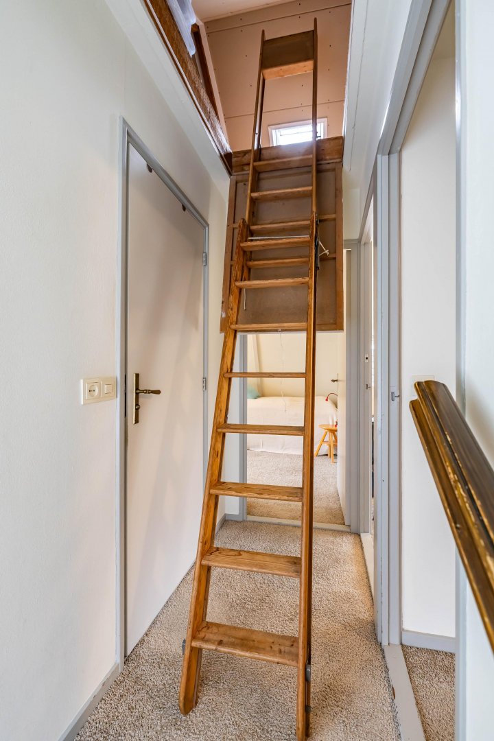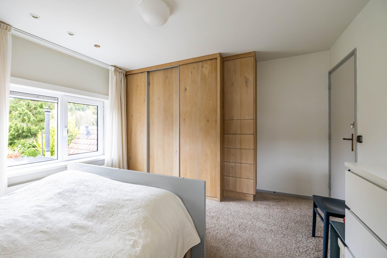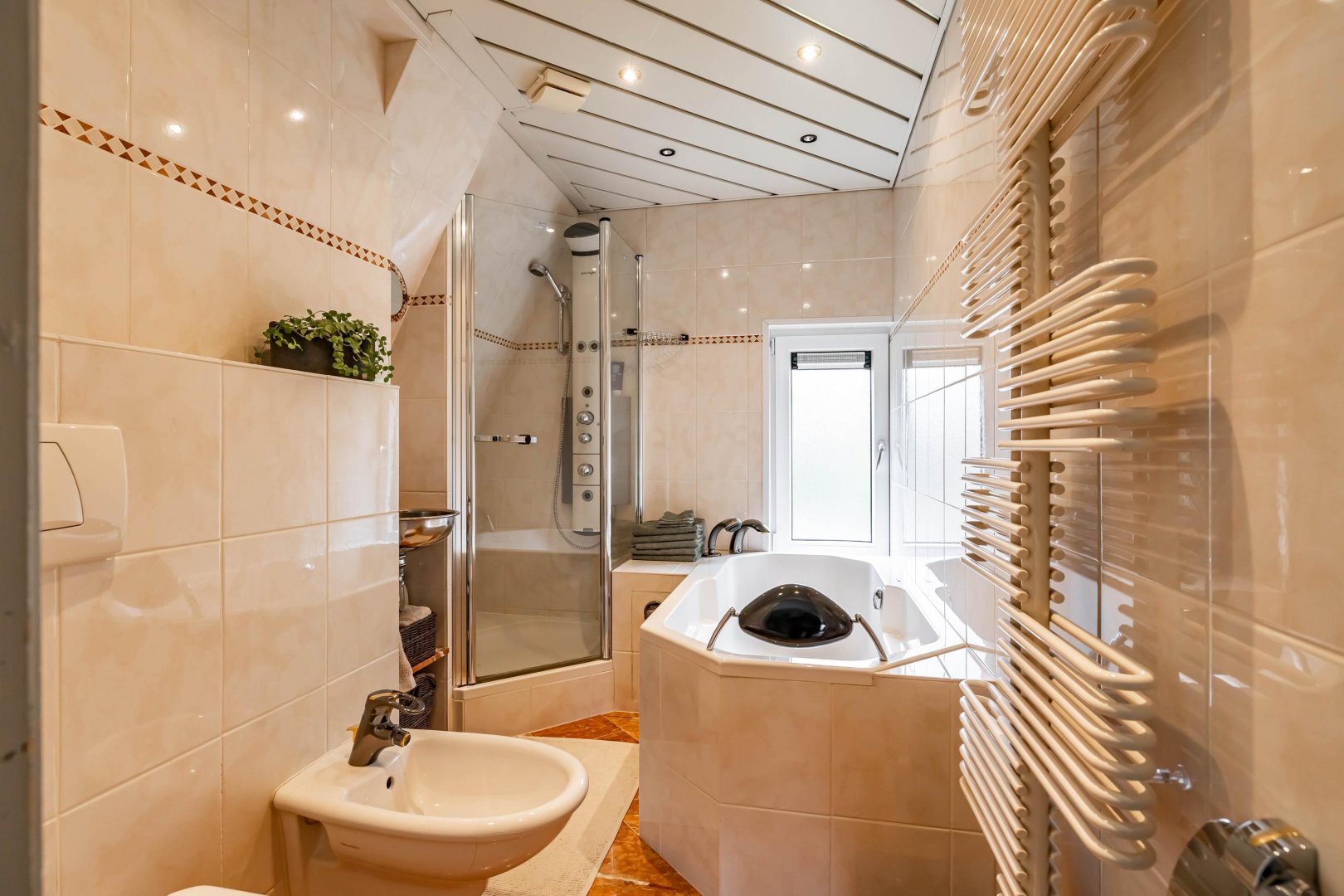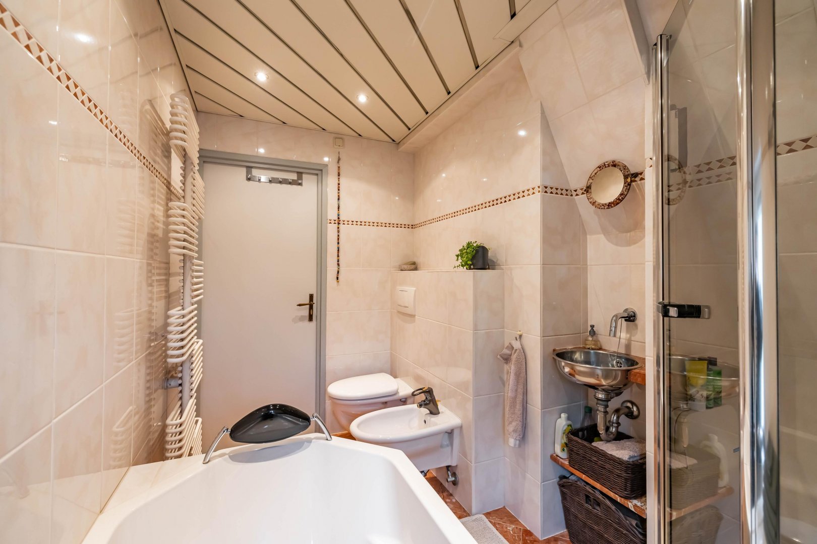 Eerste verdieping: overloop, 3 kamers resp. circa 10, 11 en 14 m². Diverse ruime inbouwkasten (2019). Compacte badkamer met douchecabine, wastafel, tweede toilet, bidet en ligbad. Via de vlizotrap bereikt u de zolderbergruimte.