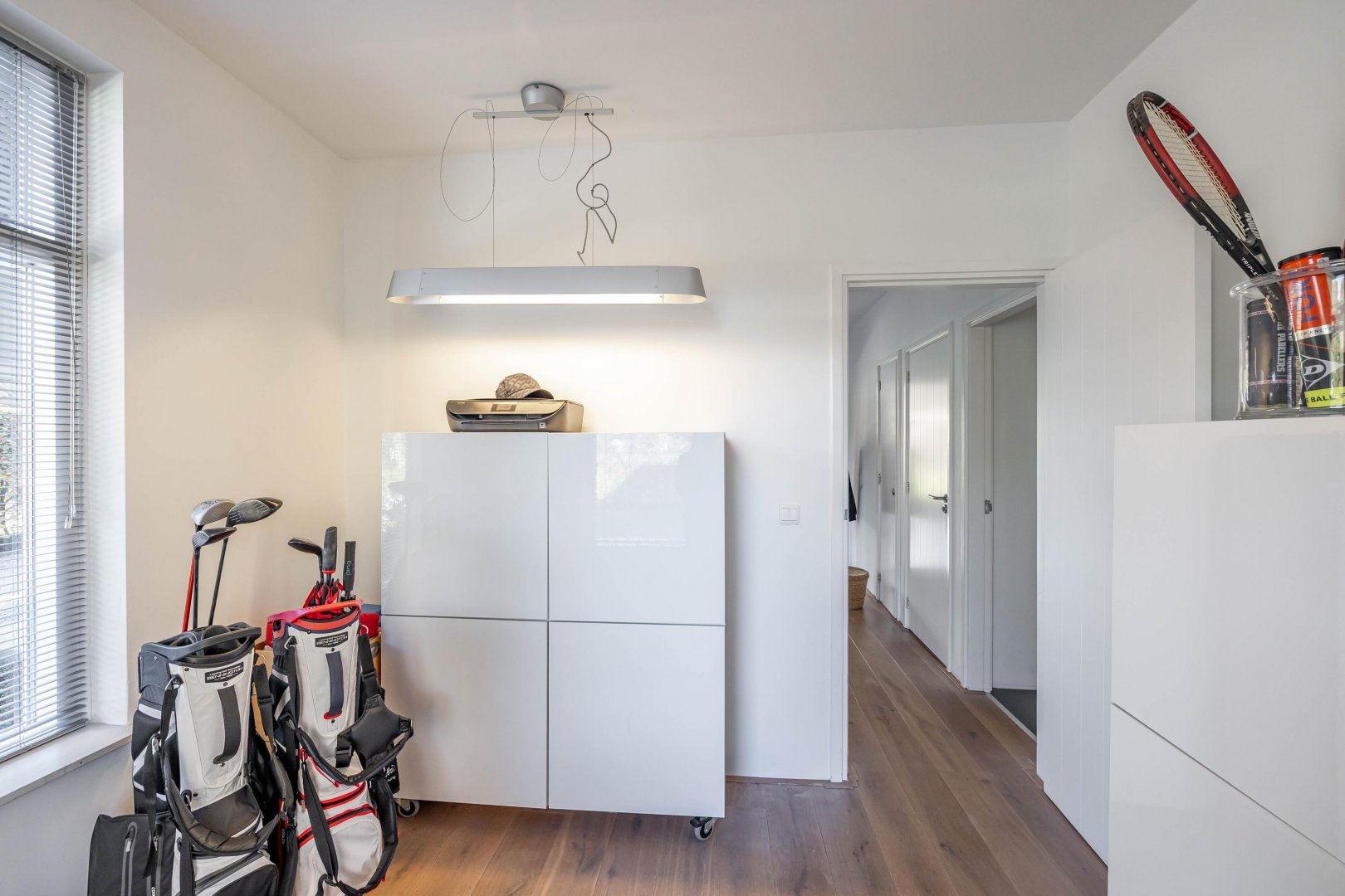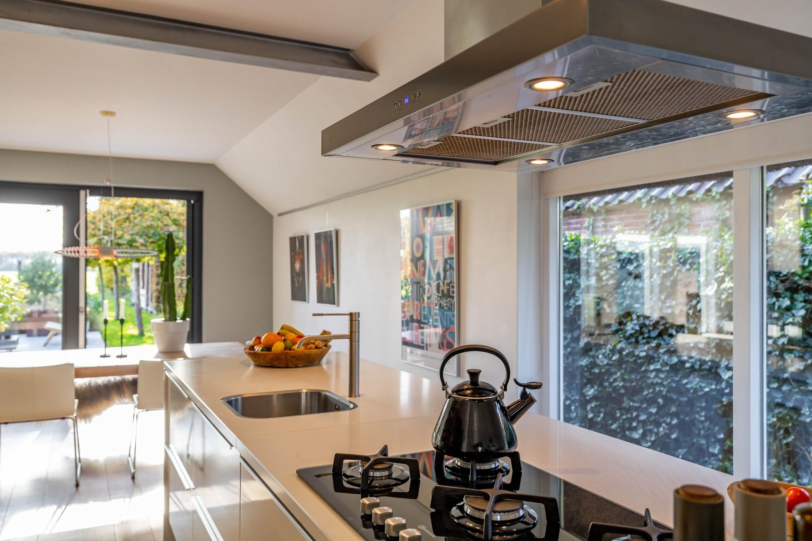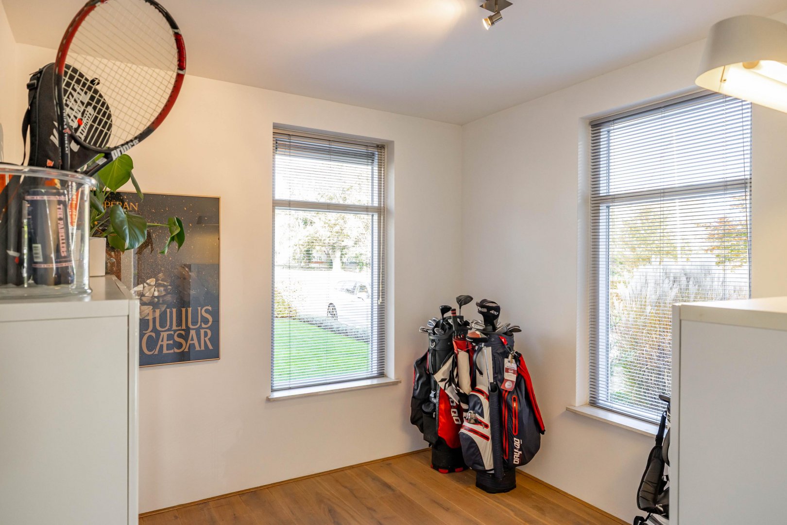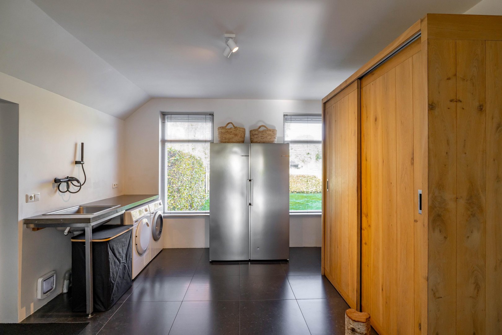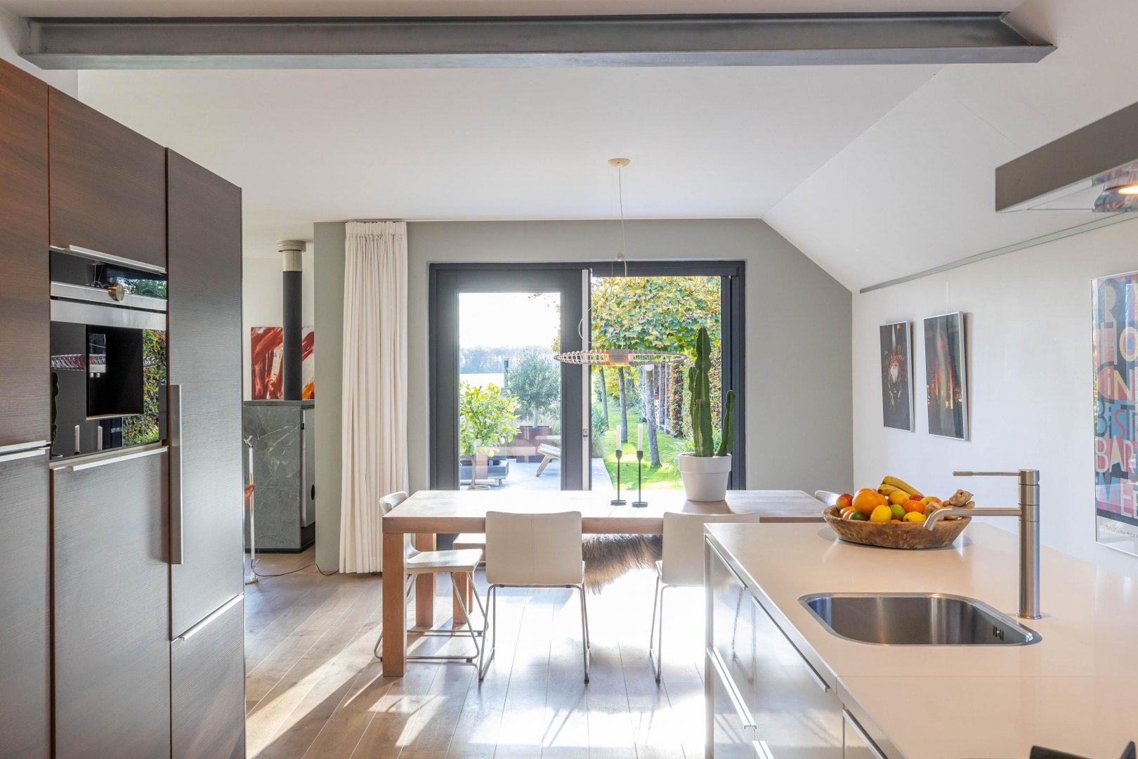 De woonkamer is zo’n ruimte waar je vanzelf ontspant, uitkijkend over de landerijen. De sfeer voelt warm en uitnodigend, een plek waar je met gemak een gezellige filmavond houdt, maar waar je in alle rust ook een cappuccino drinkt terwijl de ochtendzon via de grote ramen naar binnen valt. De open keuken sluit daar heerlijk op aan — ideaal om uitgebreid te koken terwijl familie of vrienden aan het kookeiland aanschuiven. Je ruikt als het ware al de geur van vers brood of een stoofpot die langzaam staat te pruttelen. Op de begane grond vinden we ook nog een royale bijkeuken en een werkkamer.