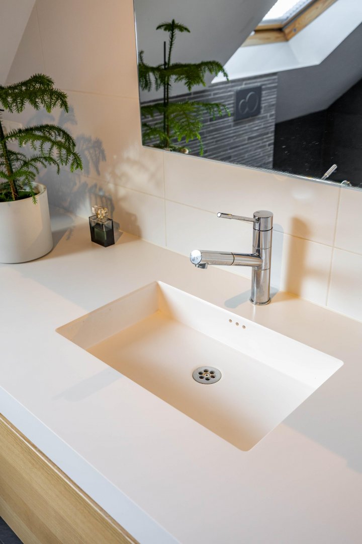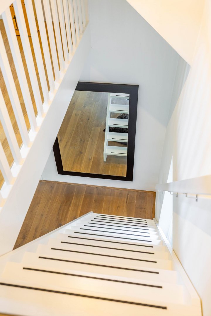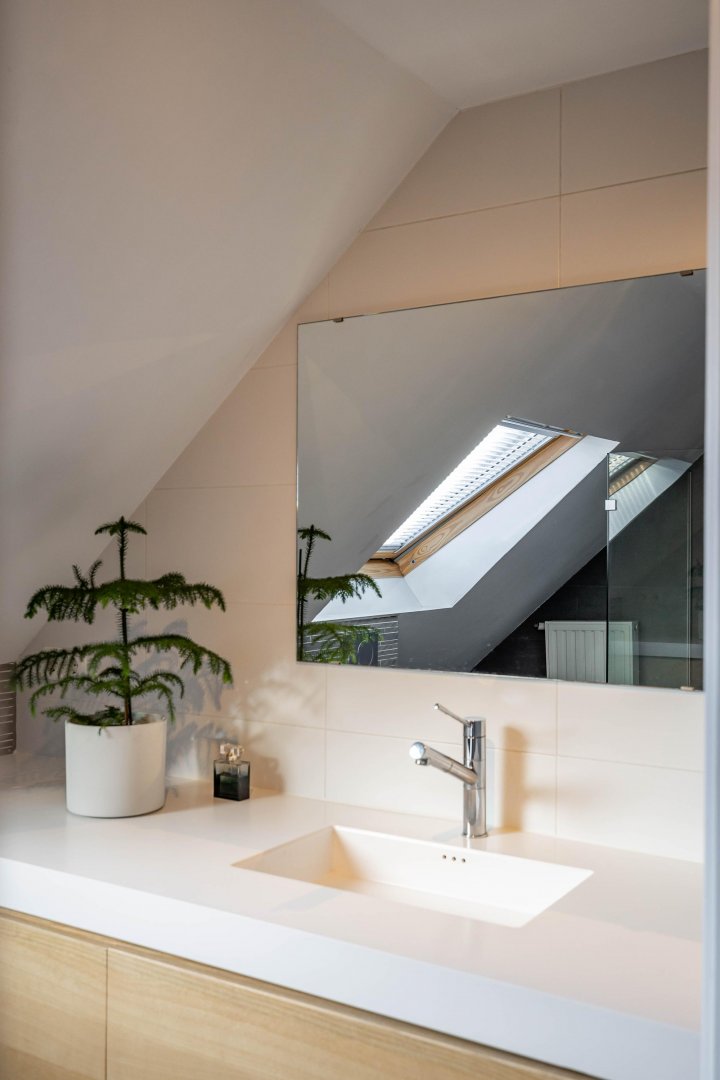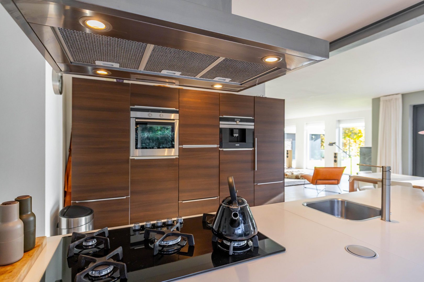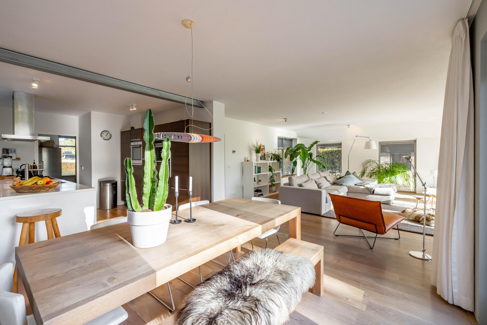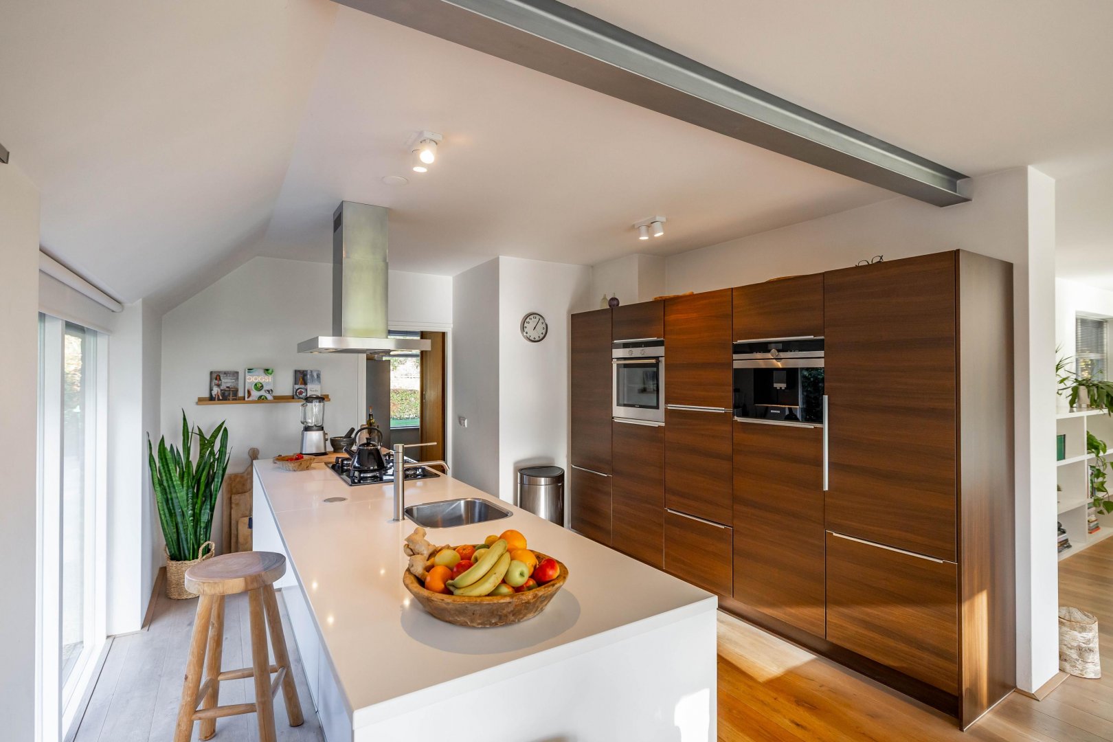 De woonkamer is zo’n ruimte waar je vanzelf ontspant, uitkijkend over de landerijen. De sfeer voelt warm en uitnodigend, een plek waar je met gemak een gezellige filmavond houdt, maar waar je in alle rust ook een cappuccino drinkt terwijl de ochtendzon via de grote ramen naar binnen valt. De open keuken sluit daar heerlijk op aan — ideaal om uitgebreid te koken terwijl familie of vrienden aan het kookeiland aanschuiven. Je ruikt als het ware al de geur van vers brood of een stoofpot die langzaam staat te pruttelen. Op de begane grond vinden we ook nog een royale bijkeuken en een werkkamer.